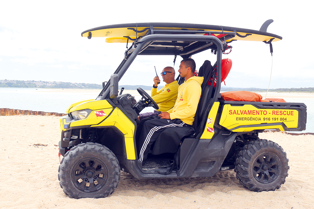 A viatura, que percorre todo o areal, é, também ela, uma novidade desta época balnear: custou 22850 euros e teve uma comparticipação municipal de 9500 euros. Comparando com a moto4 do ano passado, Filipe Vieira nota que essa tinha maior velocidade, mas esta tem uma maior estabilidade, em particular, no plano duro, permitindo a colocação de uma vítima deitada num plano rígido. Tem kit de oxigenoterapia, tem mala de abordagem e um carretel para resgate de vítimas, assim como um guincho na parte frontal com capacidade para rebocar até duas toneladas. Outra diferença: tem capacidade para três pessoas, enquanto a anterior era de duas. E tem uma prancha de salvamento, que a anterior não tinha. “Está pronta para intervir em qualquer lado”, frisa.