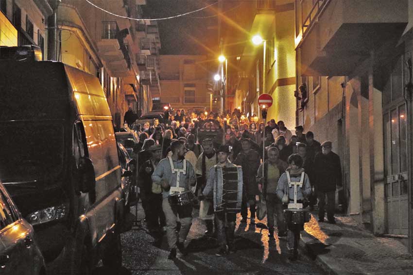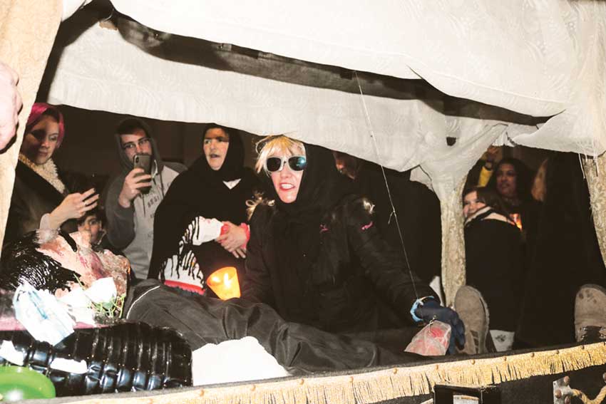 “Ele era tão bom… agora que foi!”, chora uma viúva. “A reforma é para mim!”, grita outra. “O que vai ser de mim?”, questiona-se uma terceira. De luto, com vestidos pretos e chapéus, com uma vela na mão, as “viúvas” carpideiras são de ambos os sexos e das mais diferentes idades. Umas são mais expansivas, outras lamentam-se de uma forma mais reservada no já tradicional Enterro do Entrudo das Caldas, que teve lugar na quarta-feira da semana passada. O cortejo fúnebre, da agência funerária Ká Te Espero, sai da zona da biblioteca municipal para percorrer toda a cidade. Passa pela Rainha e pela Praça da Fruta, onde faz a primeira paragem e onde se percebe a mediatização deste funeral, com as “viúvas” a tirar os telemóveis e as máquinas para fotografar e filmar o morto. A comitiva é liderada pelos bombos, que abrem o caminho. O “padre”, o “sacristão” e os “coveiros” passam à frente da carreta funerária, com o “morto”, um boneco deitado, com um garrafão de vinho ao lado e, como manda a tradição nesta cidade, um… das Caldas de grandes dimensões que é acarinhado pelas viúvas durante todo o percurso. Depois, o cortejo segue pela Rua das Montras e pela Miguel Bombarda, até passar em frente à Gazeta das Caldas. Pela Fonte Luminosa, segue para a Rua Manuel Mafra e a paragem seguinte é no Largo Frederico e Pinto Basto. Ao longo do percurso vão-se juntando cada vez mais viúvas. Por onde passa o cortejo as pessoas vão à janela para o ver passar e dizer um último adeus à folia do Carnaval. As “viúvas” discutem entre si para decidir de quem o “morto” mais gostava e quem mais gostava dele, mas também para quem é que fica, afinal, a herança. São já dezenas de pessoas, que se vão sempre queixando. Durante o caminho, o som dos bombos funde-se com os gritos da multidão.