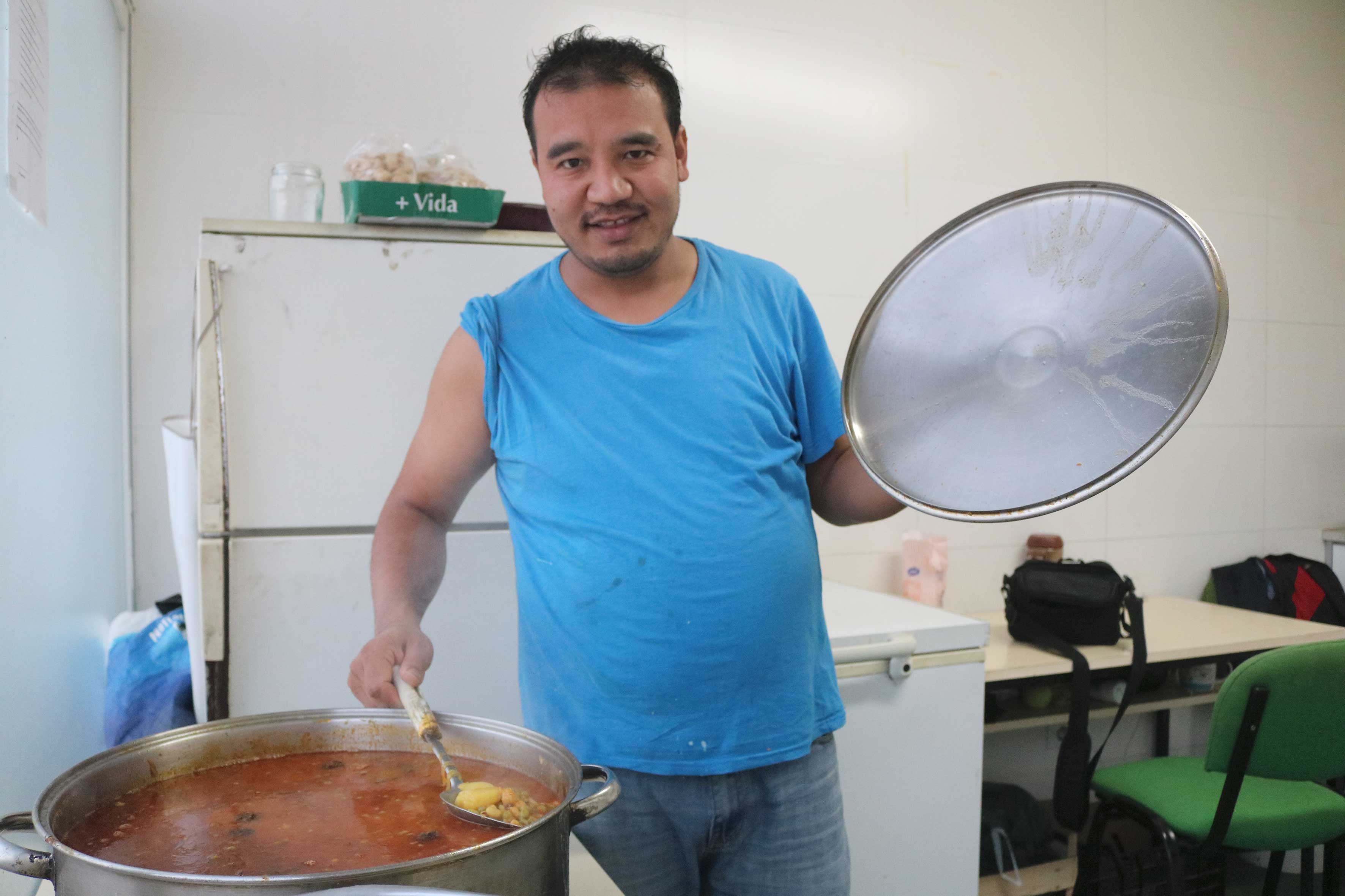 Sahkul Khatri não tem uma estrela Michellín, nem precisa. Com 32 anos, tem mais de 11 dedicados à cafetaria e restauração. “Eu voluntariei-me para cozinhar porque no Nepal trabalhava nesta área e já tinha experiência, portanto não foi nada difícil para mim ter de cozinhar para tanta gente”, conta, animado. Veio de Catmandu sozinho no último ano e tem estado no Montijo.