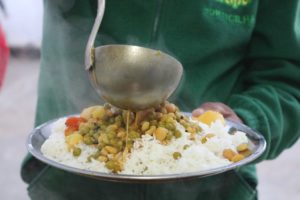 No dia em que nos recebe mostra-nos duas panelas, uma com arroz branco e outra com quti, um caldo picante com vários legumes (ervilha, grão, entre outros). E entretanto já há quem se sirva. “Para os jantares faço comidas mais ligeiras, geralmente sem carne, que comem ao almoço”, explica. “Na celebração do Dashain e Tihar, um festival religioso hindu e budista, fiz um carneiro com arroz e ficaram todos muitos felizes”, acrescenta.