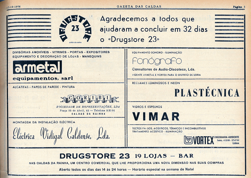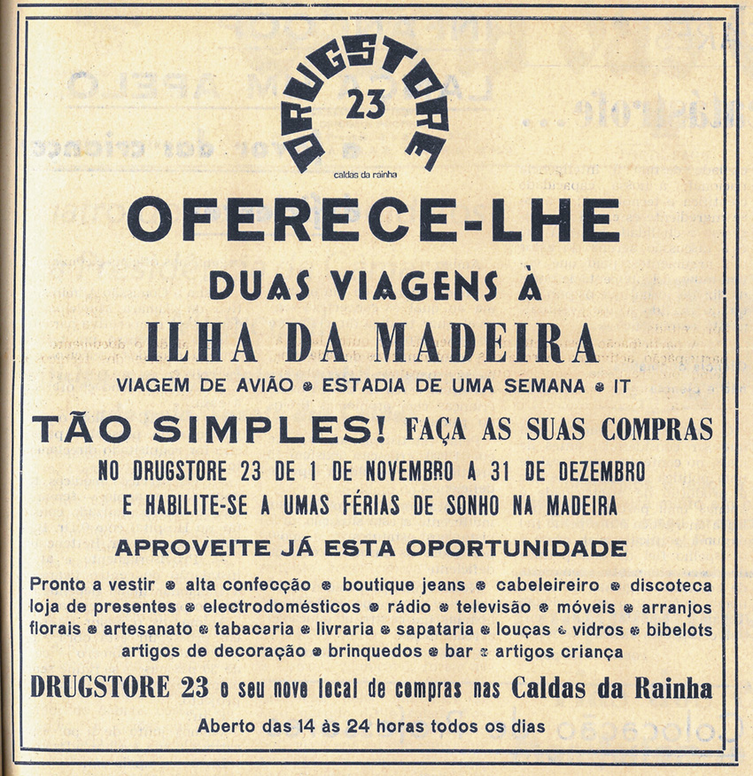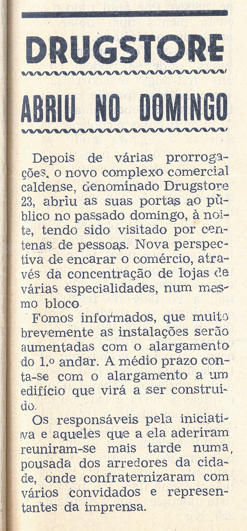 A verdade é que nas Caldas não existia nada idêntico. Refere a Gazeta das Caldas que “após várias prorrogações o novo complexo comercial caldense abriu portas no domingo à noite tendo sido visitado por centenas de pessoas”. O artigo, publicado na primeira página deste semanário, informava ainda que esta era “uma nova perspectiva de encarar o comércio, através da concentração de lojas de várias especialidades num mesmo bloco”. Mais: o Drugstore23 teria as instalções aumentadas com o previsto alargamento do 1º andar e aí chegaria às 23 lojas, tal como o nome indicava. “A médio prazo conta-se com o alargamento a um edifício que virá a ser construído”, informava o mesmo jornal.
