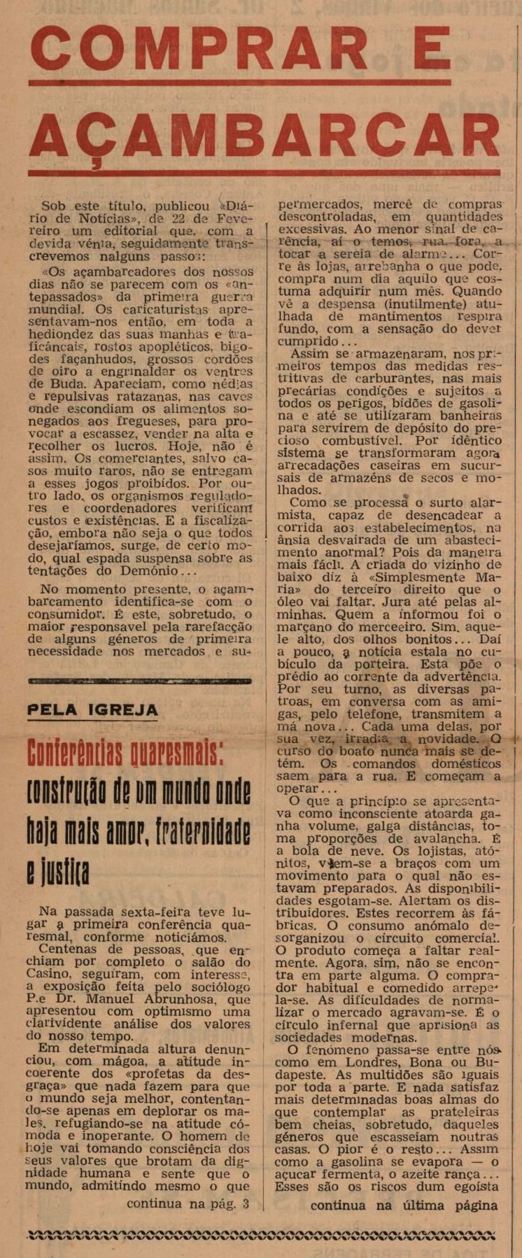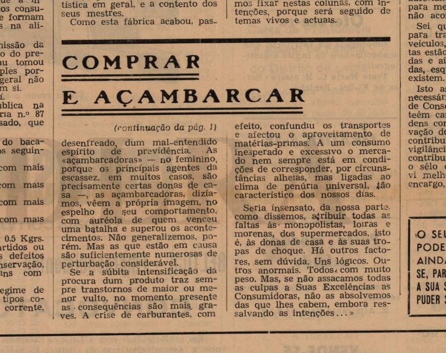 Daí a pouco, a notícia estala no cubículo da porteira. Esta põe o prédio ao corrente da advertência. Por seu turno, as diversas patroas, em conversa com as amigas, pelo telefone, transmitem a má nova… Cada uma delas, por sua vez, irradia a novidade. O curso do boato nunca mais se detém. Os comandos domésticos saem para a rua. E começam a operar… O que a princípio se apresentava como inconsciente atoarda ganha volume, galga distâncias, toma proporções de avalancha. E a bola de neve. Os lojistas, atónitos, veem-se a braços com um movimento para o qual não estavam preparados. As disponibilidades esgotam-se. Alertam os distribuidores. Estes recorrem às fábricas. O consumo anómalo desorganizou o circuito comercial. O produto começa a faltar realmente. Agora, sim, não se encontra em parte alguma. O comprador habitual e comedido arrepela-se. As dificuldades de normalizar o mercado agravam-se. É o círculo infernal que aprisiona as sociedades modernas. O fenómeno passa-se entre nós como em Londres, Bona ou Budapeste. As multidões são iguais por toda a parte. E nada satisfaz mais determinadas boas almas do que contemplar as prateleiras bem cheias, sobretudo, daqueles géneros que escasseiam noutras casas. O pior é o resto… Assim como a gasolina se evapora, açúcar fermenta, o azeite rança… Esses são os riscos dum egoísta desenfreado, dum mal-entendido espírito de previdência. As «açambarcadoras» no feminino, porque os principais agentes da escassez, em muitos casos, são precisamente certas donas de casa, as açambarcadoras, dizíamos, vêem a própria imagem, no espelho do seu comportamento com auréola de quem venceu uma batalha e superou os acontecimentos. Não generalizemos, porém. Mas as que estão em causa são suficientemente numerosas de perturbação considerável. Se a súbita intensificação da procura dum produto traz sempre transtornos de maior ou menor vulto, no momento presente as consequências são mais graves. A crise de carburantes, com efeito, confundiu os transportes e afectou o aproveitamento de matérias-primas. A um consumo inesperado e excessivo o mercado nem sempre está em condições de corresponder, por circunstâncias alheias, mas ligadas ao clima de penúria universal, tão característico dos nossos dias. Seria insensato, da nossa parte, como dissemos, atribuir todas as faltas às monopolistas, loiras e morenas, dos supermercados, isto é, às donas de casa e às suas tropas de choque. Há outros factores, sem dúvida. Uns lógicos. Outros anormais. Todos com muito peso. Mas, se não assacamos todas as culpas a Suas Excelências as Consumidoras, não as absolvemos das que lhes cabem, embora ressalvando as intenções…», diz o artigo que é um interessante testemunho da sociedade de então e do contexto em que vivia o país.