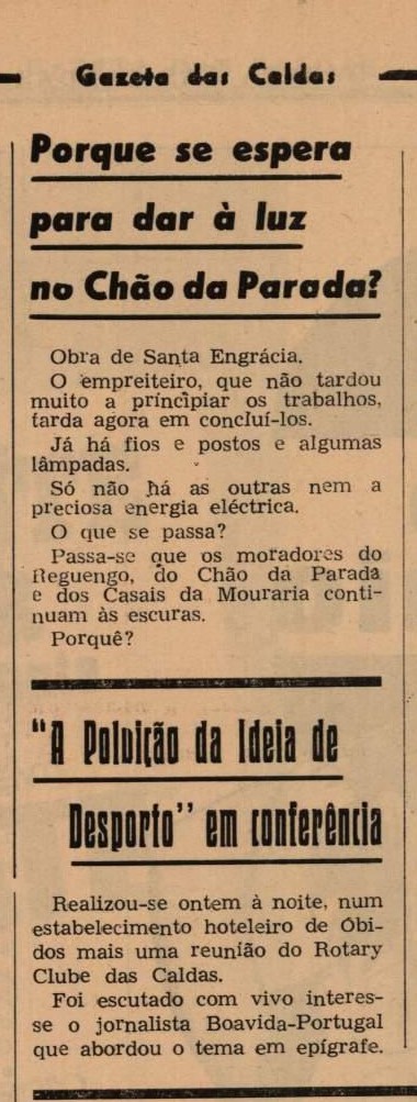 LUZ NO CHÃO DA PARADA “Porque se espera para dar à luz no Chão da Parada? Obra de Santa Engrácia. O empreiteiro, que não tardou muito a principiar os trabalhos, tarda agora em concluí-los. Já há fios e postos e algumas lâmpadas. Só não há as outras nem a preciosa energia eléctrica. O que se passa? Passa-se que os moradores do Reguengo, do Chão da Parada e dos Casais da Mouraria continuam às escuras. Porquê?”, questiona o jornal, que também aponta para um “sinal de trânsito por substituir há semanas e rua na obscuridade por falta de zelo”. Diz que “1. Não pode incumbir, de modo algum, aos que, no alto, dirigem um serviço público, seja qual for, cuidar dos «quase nadas» que a todos passam despercebidos mas que afectam respeitáveis interesses localizados apenas em uns tantos. 2. Aos que, subordinados àqueles, chefiam sectores específicos é que compete reparar os pequenos males, até sem incómodo para os seus superiores; deixando de o fazer revelam incúria, inaptidão para o exercício das funções em que estão providos e correm até o risco de se entender que há desmazelo propositado para comprometer esses superiores. 3. Pois parece que ao colocarem-se novos sinais de trânsito haveria ensejo para retirar os que estão deteriorados mas assim não acontece; é o caso daquele que, quebrado, permanece na avenida de Salazar, há semanas, sem ser retirado; e é o caso de outros que nem vale a pena referir aqui. 4. Há longos meses um candeeiro da iluminação pública da rua do general Santos Costa, a poucos metros da sede deste jornal, apareceu quebrado; só vários dias após foi retirado; e nunca mais foi substituído. Este, além de outros”, aponta a Gazeta.
