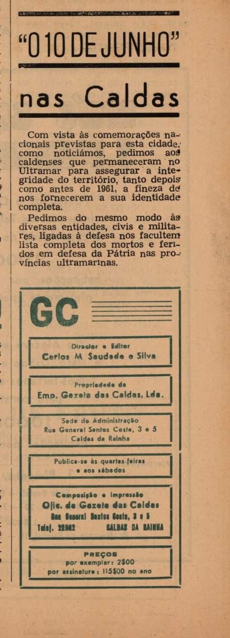 Nesta semana um dos grandes destaques era a realização das cerimónias do 10 de junho nas Caldas. “Este ano e pela primeira vez, a consagração nacional dos Heróis de Portugal que é costume efectuar-se na capital e nas sedes de distrito em 10 de Junho, terá lugar nas Caldas e não em Leiria”, lia-se na edição do dia 13. Na edição seguinte novamente o mesmo assunto: “com vista às comemorações nacionais previstas para esta cidade, como noticiámos, pedimos aos caldenses que permaneceram no Ultramar para assegurar a integridade do território, tanto depois como antes de 1961, a fineza de nos fornecerem a sua identidade completa”, referia. “Pedimos do mesmo modo às diversas entidades, civis e militares, ligadas à defesa nos facultem lista completa dos mortos e feridos em defesa da Pátria nas províncias ultramarinas”, complementava.