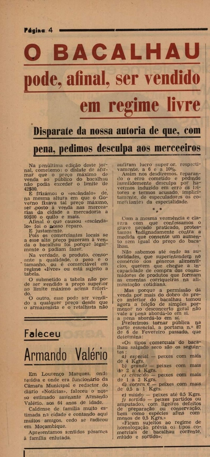 A HISTÓRIA DO BACALHAU A questão do bacalhau também continuava na ordem do dia. “O bacalhau pode, afinal, ser vendido em regime livre” é o título de um artigo desta semana que começa assim: “disparate da nossa autoria de que, com pena, pedimos desculpa aos merceeiros Na penúltima edição deste jornal, cometemos o dislate de afirmar que o preço máximo de venda ao público do bacalhau não podia exceder o limite de 42$00. E frizámos o «escândalo» de, na mesma altura em que o Governo fixava tal preço máximo, ser posto à venda nas mercearias da cidade a mercadoria a 90$00 o quilo e mais. Afinal o que causou «escândalo» foi o nosso reparo. E justamente”.