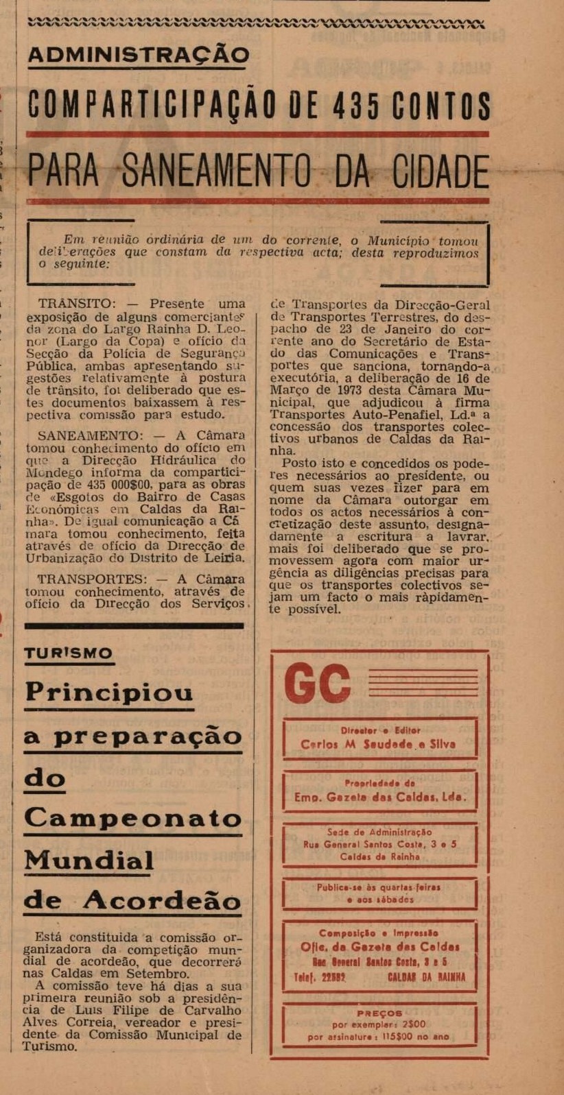 O SANEAMENTO E OS TRANSPORTES COLETIVOS Nesta semana soubemos da comparticipação de 435 contos para saneamento da cidade. “A Câmara tomou conhecimento do ofício em que a Direcção Hidráulica do Mondego informa da comparticipação de 435 000$00, para as obras de «Esgotos do Bairro de Casas Económicas em Caldas da Rainha”. Na mesma semana, a autarquia “tomou conhecimento, através de oficio da Direcção dos Serviços, de Transportes da Direcção-Geral de Transportes Terrestres, do despacho de 23 de Janeiro do corrente ano do Secretário de Estado das Comunicações e Transportes que sanciona, tornando-a executória, a deliberação de 16 de Março de 1973 desta Câmara Municipal, que adjudicou à firma Transportes Auto-Penafiel, Lda., a concessão dos transportes colectivos urbanos de Caldas da Rainha” e que “posto isto e concedidos os poderes necessários ao presidente, ou quem suas vezes fizer para em nome da Câmara outorgar em todos os actos necessários à concretização deste assunto, designadamente a escritura a lavrar, mais foi deliberado que se promovessem agora com maior urgência as diligências precisas para que os transportes colectivos sejam um facto o mais rapidamente possível”.