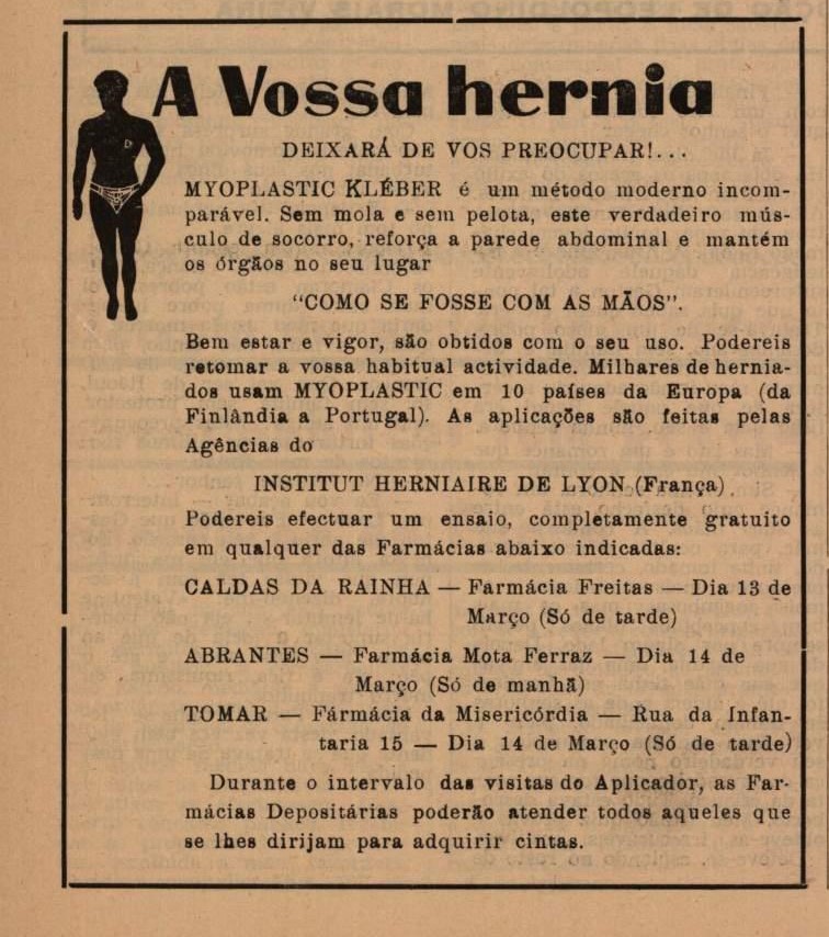 Trazemos alguns anúncios curiosos: “a Vossa hérnia deixará de vos preocupar!… Myoplastic Kleber é um método moderno incomparável. Sem mola e sem pelota, este verdadeiro músculo de socorro, reforça a parede abdominal e mantém os órgãos no seu lugar. “Como se fosse com as mãos”. Bem-estar e vigor, são obtidos com o seu uso. Podereis retomar a vossa habitual actividade. Milhares de herniados usam Myoplastic em 10 países da Europa (da Finlândia a Portugal). As aplicações são feitas pelas Agências do Institut Herniarire de Lyon (França). Podereis efectuar um ensaio, completamente gratuito em qualquer das Farmácias abaixo indicadas: CALDAS DA RAINHA – Farmácia Freitas – Dia 13 de Março (Só de tarde); ABRANTES – Farmácia Mota Ferraz Dia 14 de Março (Só de manha); TOMAR – Farmácia da Misericórdia, Rua da Infantaria 15 – Dia 14 de Março (Só de tarde). Durante o intervalo das visitas do Aplicador, as Farmácias Depositárias poderão atender todos aqueles que se lhes dirijam para adquirir cintas”.