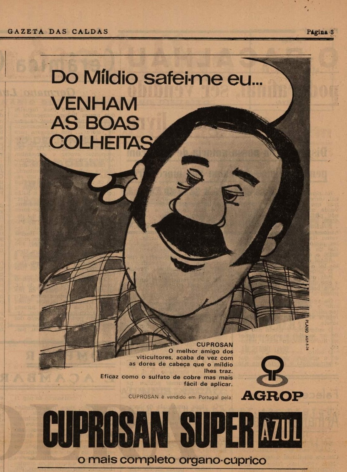 Outro: “Do Míldio safei-me eu… Venham as boas colheitas. Cuprosan. O melhor amigo dos viticultores, acaba de vez com as dores de cabeça que o míldio Ihe traz. Eficaz como o sulfato de cobre mas mais fácil de aplicar. Cuprosan é vendido em Portugal pela: AGROP. Cuprosan Super Azul – o mais completo organo-cúprico”.