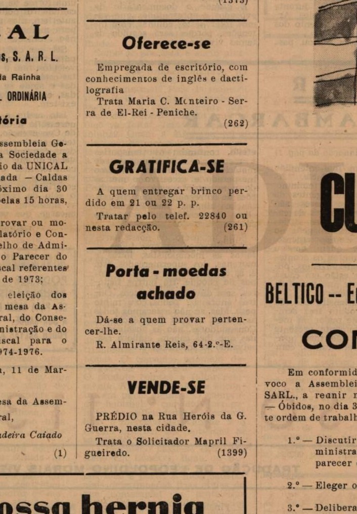 CURIOSIDADES Trazemos ainda duas curiosidades: “gratifica-se. A quem entregar brinco perdido em 21 ou 22 p. p. Tratar pelo telef. 22840 ou nesta redacção” e o caso do “porta-moedas achado. Dá-se a quem provar pertencer-lhe. R. Almirante Reis, 64-2.-E”.