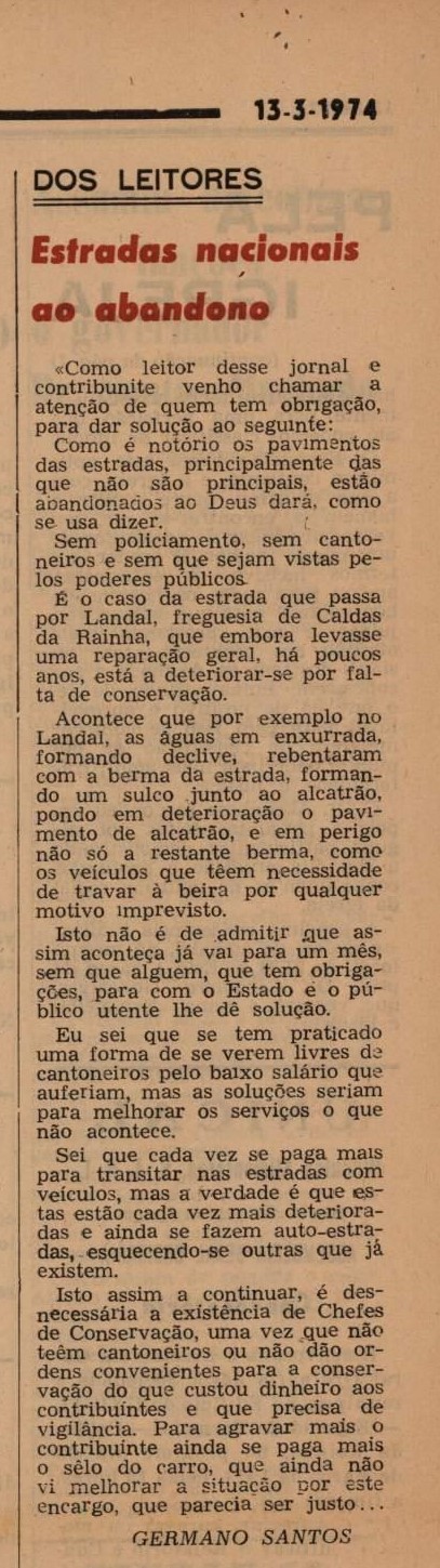 AS ESTRADAS Sob o título: “Estradas nacionais ao abandono” a Gazeta traz uma carta de um leitor, assinada pelo próprio. “Como leitor desse jornal e contribuinte venho chamar atenção de quem tem obrigação, para dar solução ao seguinte: como é notório os pavimentos das estradas, principalmente das que não são principais, estão abandonados ao Deus dará, como se usa dizer. Sem policiamento, sem cantoneiros e sem que sejam vistas pelos poderes públicos. É o caso da estrada que passa por Landal, freguesia de Caldas da Rainha, que embora levasse uma reparação geral, há poucos anos, está a deteriorar-se por falta de conservação. Acontece que por exemplo no Landal, as águas em enxurrada, formando declive, rebentaram com a berma da estrada, formando um sulco junto ao alcatrão, pondo em deterioração o pavimento de alcatrão, e em perigo não só a restante berma, como os veículos que têem necessidade de travar à beira por qualquer motivo imprevisto. Isto não é de admitir que assim aconteça já vai para um mês, sem que alguém, que tem obrigações, para com o Estado e o público utente lhe dê solução. Eu sei que se tem praticado uma forma de se verem livres de cantoneiros pelo baixo salário que auferiam, mas as soluções seriam para melhorar os serviços o que não acontece. Sei que cada vez se paga mais para transitar nas estradas com veículos, mas a verdade é que estas estão cada vez mais deterioradas e ainda se fazem auto-estradas, esquecendo-se outras que já existem. Isto assim a continuar, é desnecessária a existência de Chefes de Conservação, uma vez que não têem cantoneiros ou não dão ordens convenientes para a conservação do que custou dinheiro aos contribuintes e que precisa de vigilância. Para agravar mais o contribuinte ainda se paga mais o sêlo do carro, que ainda não vi melhorar a situação por este encargo, que parecia ser justo…”