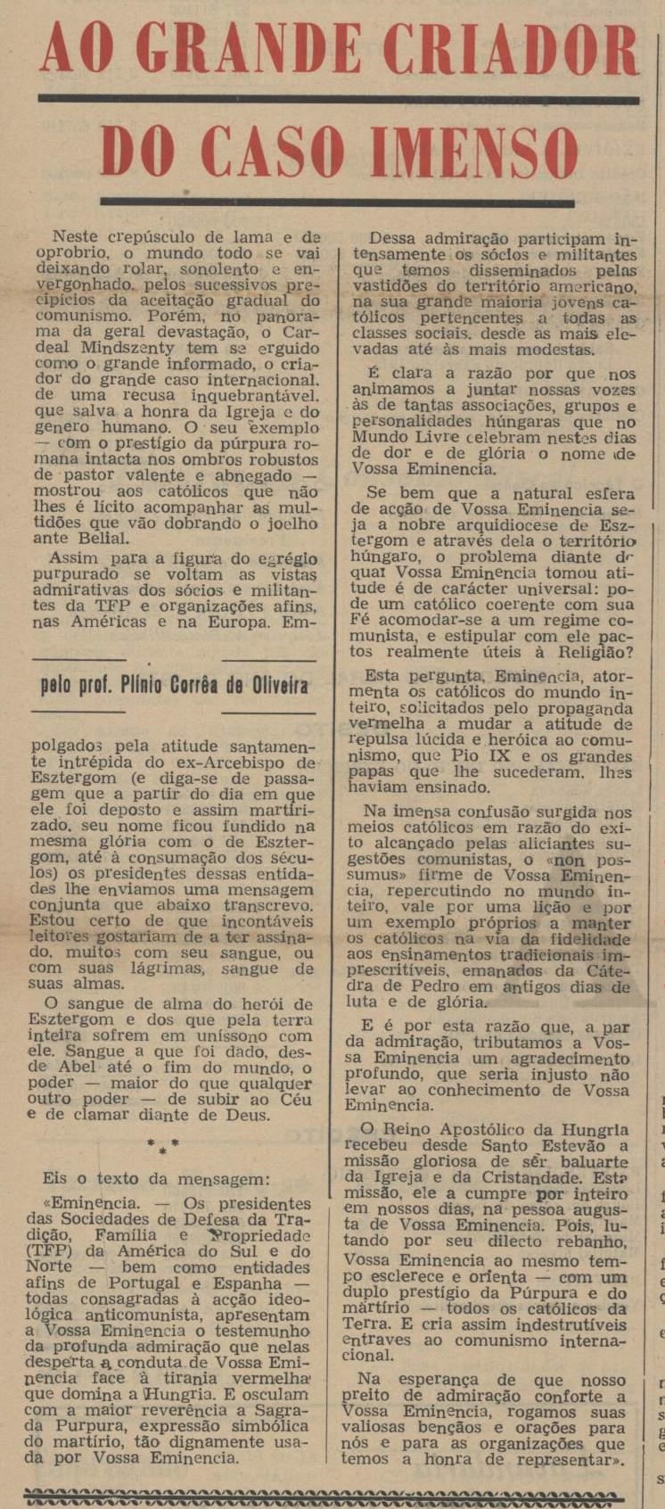AO GRANDE CRIADOR DO CASO IMENSO Interessante é também perceber, na edição do dia 24 de abril, um texto de Plínio Correa de Oliveira, também vindo de Lisboa, com a doutrinação oficial do regime. “Ao grande criador do caso imenso” é o título do artigo que diz que “neste crepúsculo de lama e de oprobrio, o mundo todo se vai deixando rolar, sonolento e envergonhado, pelos sucessivos precipicios da aceitação gradual do comunismo. Porém, no panorama da geral devastação, o Cardeal Mindszenty tem se erguido como o grande informado, o criador do grande caso internacional, de uma recusa inquebrantável, que salva a honra da Igreja e do genero humano. O seu exemplo com o prestígio da púrpura romana intacta nos ombros robustos de pastor valente e abnegado mostrou aos católicos que não lhes é lícito acompanhar as multidões que vão dobrando o joelho ante Belial. Assim para a figura do egrégio purpurado se voltam as vistas admirativas dos sócios e militantes da TFP e organizações afins, nas Américas e na Europa. Em-polgados pela atitude santamente intrépida do ex-Arcebispo de Esztergom (e diga-se de passagem que a partir do dia em que ele foi deposto e assim martirizado, seu nome ficou fundido na mesma glória com o de Esztergom, até à consumação dos séculos) os presidentes dessas entidades lhe enviamos uma mensagem conjunta que abaixo transcrevo. Estou certo de que incontáveis leitores gostariam de a ter assinado, muitos com seu sangue, ou com suas lágrimas, sangue de suas almas. O sangue de alma do herói de Esztergom e dos que pela terra inteira sofrem em uníssono com ele. Sangue a que foi dado, desde Abel até o fim do mundo, o poder maior do que qualquer outro poder de subir ao Céu e de clamar diante de Deus. Eis o texto da mensagem: «Eminencia. Os presidentes das Sociedades de Defesa da Tradição, Familia e Propriedade (TFP) da América do Sul e do Norte bem como entidades afins de Portugal e Espanha todas consagradas à acção ideológica anticomunista, apresentam a Vossa Eminencia o testemunho da profunda admiração que nelas desperta a conduta de Vossa Eminencia face à tirania vermelha que domina a Hungria. E osculam com a maior reverência a Sagrada Purpura, expressão simbólica do martírio, tão dignamente usada por Vossa Eminencia. Dessa admiração participam intensamente os sócios e militantes que temos disseminados pelas vastidões do território americano, na sua grande maioria jovens católicos pertencentes a todas as classes sociais, desde as mais elevadas até às mais modestas. É clara a razão por que nos animamos a juntar nossas vozes às de tantas associações, grupos e personalidades húngaras que no Mundo Livre celebram nestes dias de dor e de glória o nome de Vossa Eminencia. Se bem que a natural esfera de acção de Vossa Eminencia seja a nobre arquidiocese de Esztergom e através dela o território húngaro, o problema diante do qual Vossa Eminencia tomou atitude é de carácter universal: pode um católico coerente com sua Fé acomodar-se a um regime comunista, e estipular com ele pactos realmente úteis à Religião? Esta pergunta, Eminencia, atormenta os católicos do mundo inteiro, solicitados pelo propaganda vermelha a mudar a atitude de repulsa lúcida e heróica ao comunismo, que Pio IX e os grandes papas que lhe sucederam, lhes haviam ensinado. Na imensa confusão surgida nos meios católicos em razão do exito alcançado pelas aliciantes sugestões comunistas, o «non possumus» firme de Vossa Eminencia, repercutindo no mundo inteiro, vale por uma lição e por um exemplo próprios a manter os católicos na via da fidelidade aos ensinamentos tradicionais imprescritíveis, emanados da Cátedra de Pedro em antigos dias de luta e de glória. E é por esta razão que, a par da admiração, tributamos a Vossa Eminencia um agradecimento, profundo, que seria injusto não levar ao conhecimento de Vossa Eminencia. O Reino Apostólico da Hungria recebeu desde Santo Estevão a missão gloriosa de sér, baluarte da Igreja e da Cristandade. Esta missão, ele a cumpre por inteiro em nossos dias, na pessoa augusta de Vossa Eminencia. Pois, lutando por seu dilecto rebanho, Vossa Eminencia ao mesmo tempo esclerece e orienta com um duplo prestígio da Púrpura e do mártírio todos os católicos da Terra. E cria assim indestrutíveis entraves ao comunismo internacional. Na esperança de que nosso preito de admiração conforte a Vossa Eminencia, rogamos suas valiosas bençãos e orações para nós e para as organizações que temos a honra de representar».