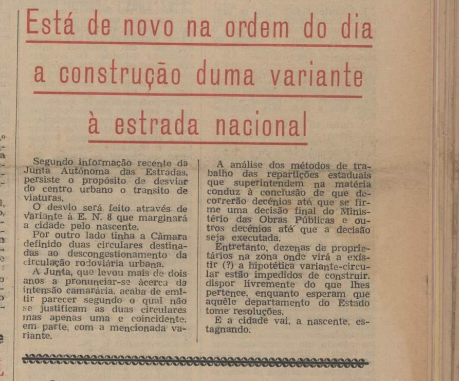 A questão da variante à estrada nacional é, também, um tema de referência. “Está de novo na ordem do dia a construção duma variante à estrada nacional”, lia-se na Gazetado dia 24. “Segundo informação recente da Junta Autónoma das Estradas, persiste o propósito de desviar do centro urbano o transito de viaturas. O desvio será feito através de variante à E. N. 8 que marginará a cidade pelo nascente. Por outro lado tinha a Câmara definido duas circulares destinadas ao descongestionamento da circulação rodoviária urbana. A Junta, que levou mais de dois anos a pronunciar-se àcerca da intensão camarária, acaba de emitir parecer segundo o qual não se justificam as duas circulares mas apenas uma e coincidente, em parte, com a mencionada variante.A análise dos métodos de trabalho das repartições estaduais que superintendem na matéria conduz à conclusão de que decorrerão decénios até que se firme uma decisão final do Ministério das Obras Públicas e outros decénios até que a decisão seja executada. Entretanto, dezenas de proprietários na zona onde virá a existir (?) a hipotética variante-circular estão impedidos de construir, dispor livremente do que lhes pertence, enquanto esperam que aquêle departamento do Estado tome resoluções. E a cidade vai, a nascente, estagnando”, acusa a Gazeta das Caldas, numa edição que tem ainda a particularidade de, por um lado, publicar o relatório de atividades da SECLA, na altura a principal unidade industrial das Caldas, e, por outro, anunciar também a instalação de uma nova indústria, de capitais suiços, que não se viria a concretizar. O jornal anunciava-a como certa e referia que ia empregar mais de uma centena de pessoas. “Começa a dar frutos a política de industrialização há meses iniciada pelo Municipio. Consiste a nova orientação camarária em dispor das largas centenas de metros quadrados de terrenos do seu domínio privado para vender a empresas industriais merecedoras de crédito e capazes de actividades fabris válidas. Correspondendo à iniciativa da Edilidade o Estado, através dos serviços competentes, está a canalizar para as Caldas os industriais estrangeiros que mostram interesse em investir e a Imprensa chama a atenção dos congéneres portugueses para as facilidades que aqui podem encontrar. Existe, em consequencia, uma dezena de perspectivas de investimentos de volume médio e pequeno no sector fabril. Vão desde a reduzida empresa de pré-esforçados, a querer dez mil metros de terreno, até ao grande consórcio luso-nipónico predisposto a dar emprego, em pouco tempo, a 3.000 pessoas. Tudo, porém, não tem passado até aqui do plano das prospecções por parte dos particulares e dos ingentes esforços dos «camarários para concretizações. Uma destas está, finalmente, à vista: Empresa de capitais, suiços vai implantar nas imediações do Campo edifícios que cobrirão 32.000 metros de terreno numa área de 7.8 hectares. O projecto está pronto. Assegurado está, tambem, o necessário licenciamento. Falta apenas firmar a compra à Câmara do terreno preciso que há-de ser vendido dentro de dias, segundo se espera”, garantia o jornal.