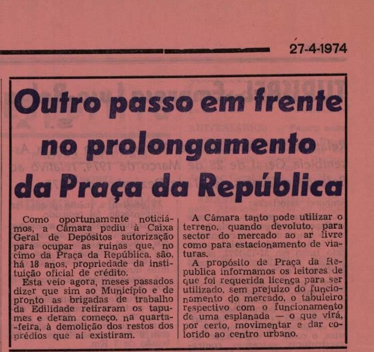 A PRAÇA DA FRUTA Ao invés, a Gazetaconta-nos que havia sido dado “outro passo em frente no prolongamento da Praça da República”. É que “como oportunamente noticiámos, a Câmara pediu à Caixa Geral de Depósitos autorização para ocupar as ruinas que, no cimo da Praça da República, são, há 18 anos, propriedade da instituição oficial de crédito. Esta veio agora, meses passados dizer que sim ao Município e de pronto as brigadas de trabalho da Edilidade retiraram os tapumes e deram começo, na quarta-feira, à demolição dos restos dos prédios que aí existiram”.