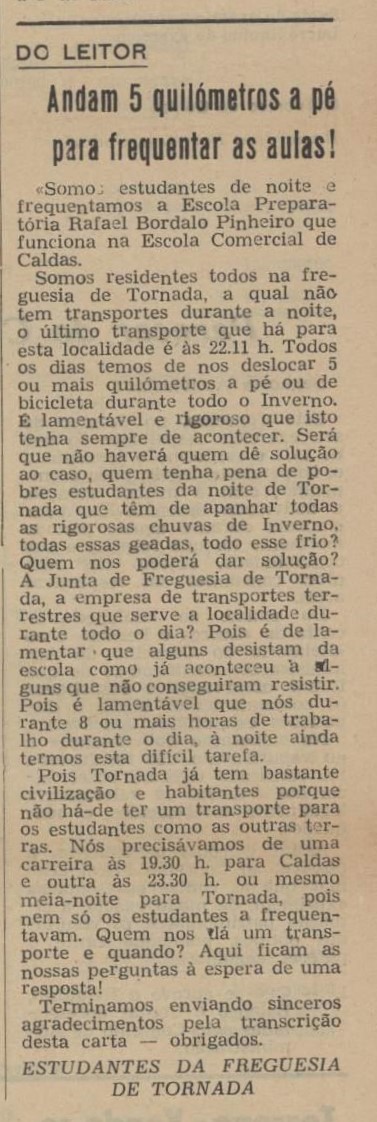 A MOBILIDADE Como temos visto, a mobilidade era, há 50 anos, um dos grandes desafios, como é ainda hoje. Nesta semana a Gazetapublicava uma carta de estudantes da Escola Preparatória Rafael Bordalo Pinheiro que eram naturais de Tornada e que não tinham transportes para a escola. “Andam 5 quilómetros a pé para frequentar as aulas!” titulava o artigo, que começava por explicar que “Somos estudantes de noite e frequentamos a Escola Preparatória Rafael Bordalo Pinheiro que funciona na Escola Comercial de Caldas. Somos residentes todos na freguesia de Tornada, a qual não tem transportes durante a noite, o último transporte que há para esta localidade é às 22.11 h. Todos os dias temos de nos deslocar 5 ou mais quilómetros a pé ou de bicicleta durante todo o Inverno. É lamentável e rigoroso que isto tenha sempre de acontecer. Será que não haverá quem dê solução ao caso, quem tenha, pena de pobres estudantes da noite de Tornada que têm de apanhar todas as rigorosas chuvas de Inverno, todas essas geadas, todo esse frio? Quem nos poderá dar solução? A Junta de Freguesia de Tornada, a empresa de transportes terrestres que serve a localidade durante todo o dia? Pois é de lamentar que alguns desistam da escola como já aconteceu a alguns que não conseguiram resistir. Pois é lamentável que nós durante 8 ou mais horas de trabalho durante o dia, à noite ainda termos esta difícil tarefa. Pois Tornada já tem bastante civilização e habitantes porque não há-de ter um transporte para os estudantes como as outras terras. Nós precisávamos de uma carreira às 19.30 h. para Caldas e outra às 23.30 h. ou mesmo meia-noite para Tornada, pois nem só os estudantes a frequentavam. Quem nos dá um transporte e quando? Aqui ficam as nossas perguntas à espera de uma resposta! Terminamos enviando sinceros agradecimentos pela transcrição desta carta – obrigados. Estudantes da Freguesia de Tornada”.