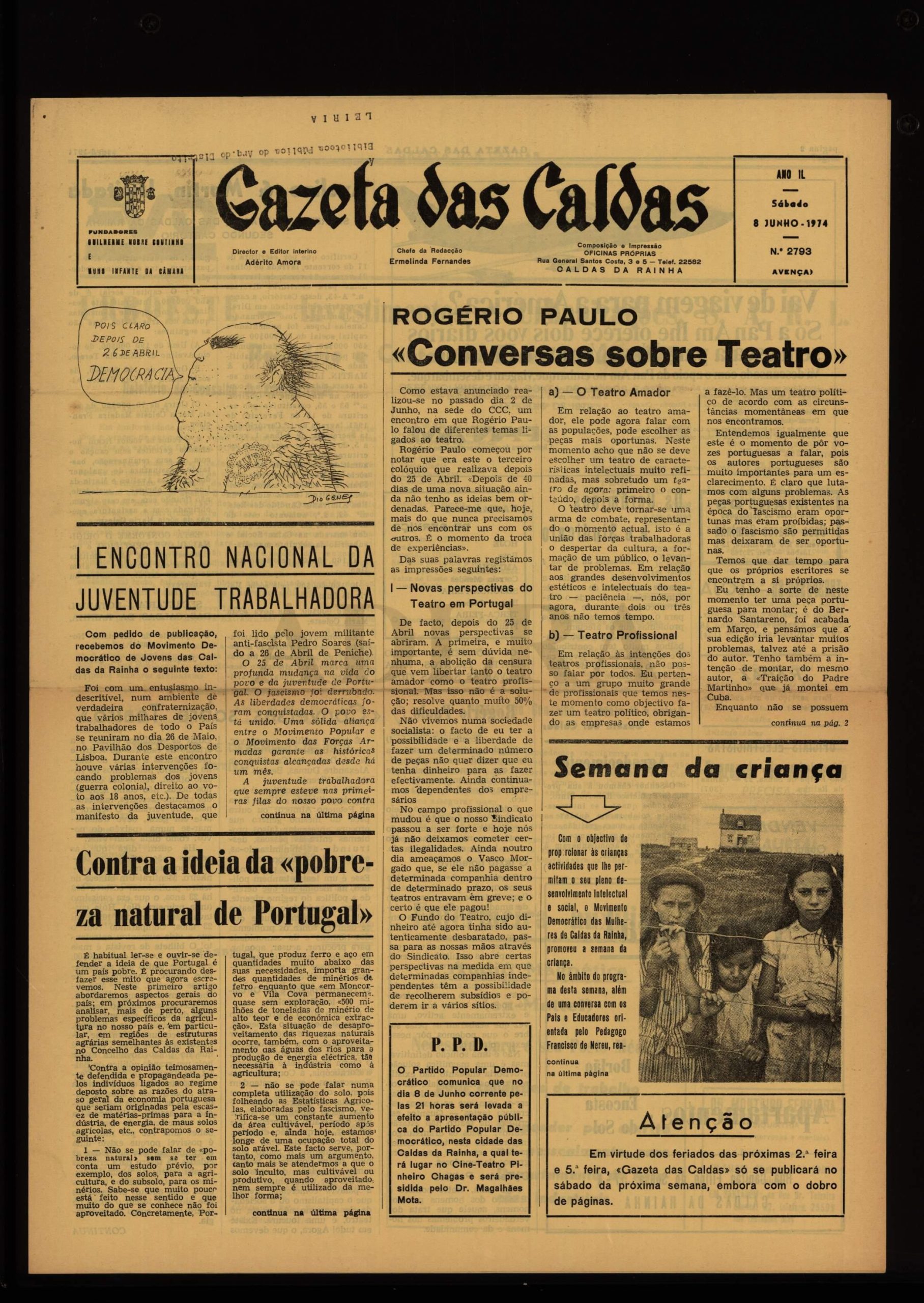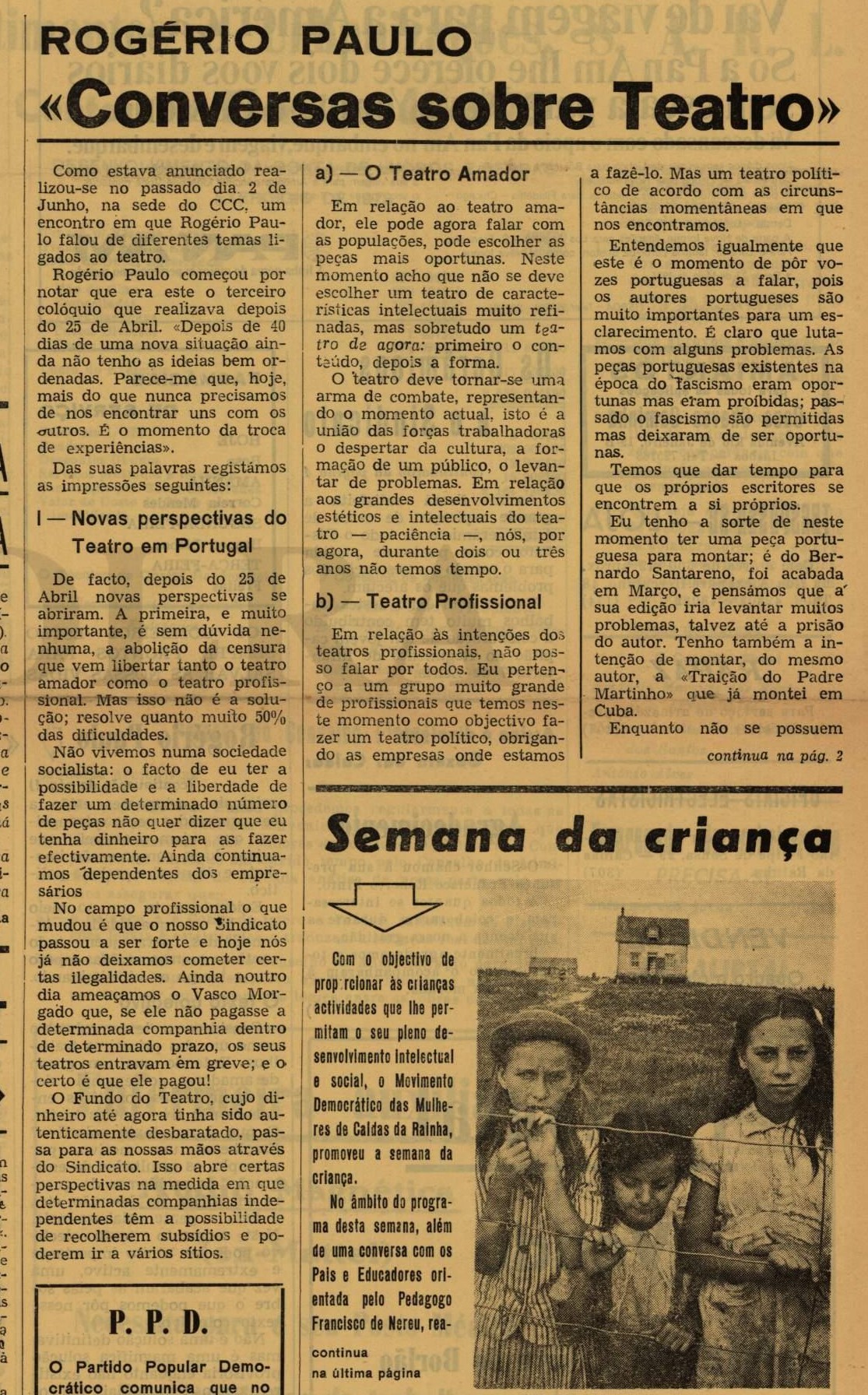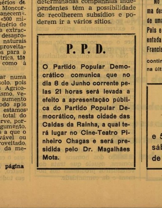 Ficamos a saber que “no dia 8 de Junho corrente pelas 21 horas será levada a efeito a apresentação pública do Partido Popular Democrático, nesta cidade das Caldas da Rainha, a qual terá lugar no Cine-Teatro Pinheiro Chagas e será presidida pelo Dr. Magalhães Mota”, que o quinto acampamento da Casa do Benfica na Mata, seria entre os dias 8 e 10 de junho e que Rogério Paulo veio às Caldas no dia 2 de junho para ter “conversas sobre teatro”.