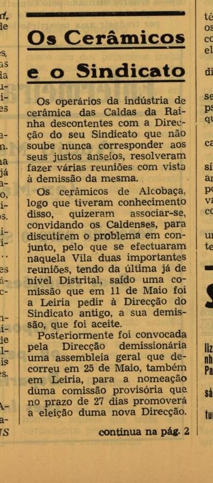 “Os Cerâmicos e o Sindicato” é o título de um artigo interessante que nos conta que “os operários da indústria de cerâmica das Caldas da Rainha descontentes com a Direcção do seu Sindicato que não soube nunca corresponder aos seus justos anseios, resolveram fazer várias reuniões com vista à demissão da mesma. Os cerâmicos de Alcobaça, logo que tiveram conhecimento disso, quizeram associar-se, convidando os Caldenses, para discutirem o problema em conjunto, pelo que se efectuaram naquela Vila duas importantes reuniões, tendo da última já de nível Distrital, saído uma comissão que em 11 de Maio foi a Leiria pedir à Direcção do Sindicato antigo, a sua demissão, que foi aceite. Posteriormente foi convocada pela Direcção demissionária uma assembleia geral que decorreu em 25 de Maio, também em Leiria, para a nomeação duma comissão provisória que no prazo de 27 dias promoverá a eleição duma nova Direcção. Assim ficará satisfeita a grande aspiração de cerca de 4 mil cerâmicos de todo o Distrito, como ponto de partida para o estudo e a resolução dos problemas que os afectam. Para o bom êxito destes trabalhos muito tem contribuido a colaboração de um jovem capitão do Regimento de Infantaria 7 de Leiria”.