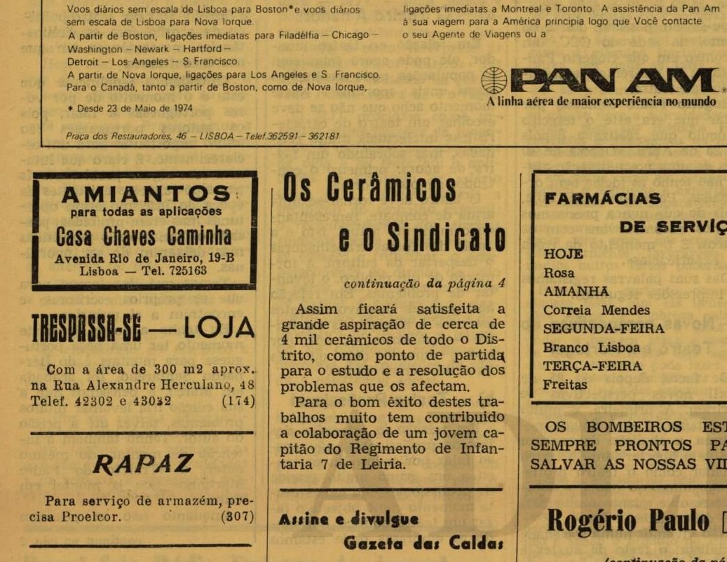 Esta semana é notícia na Gazeta das Caldas uma “Convocatória Falsa” que conta que “durante a semana anterior foram distribuidas convocatórias por todos os Operários cerâmicos de “Barro Branco” da cidade, para uma reunião a decorrer na passada terça-feira às 21.30 horas no Sindicato Nacional dos Empregados de Escritório e Caixeiros do Distrito de Leiria, desta cidade. Esperançadas no citado encontro para uma provável resolução monetária e discussão de regalias a pedir ao Sindicato, compareceu cerca de meia centena de Operários no local e hora indicada na referida convocatória. Acontece porém que, eram 23 horas aproximadamente e os até então desconhecidos organizadores da “REUNIÃO DE OPERÁRIOS DE CERÂMICA” não apareceram. Perguntamos: Que seria isto? Brincamos às reuniões ou brincamos aos Operários de Cerâmica? Confirmado que nenhum dos falsos organizadores viria, o nosso bem conhecido caldense Senhor Furriel, levantou-se de entre os presentes dirigindo algumas palavras e apelando para que de ora em diante os operárias cerâmicos só comparecem em Reuniões anunciadas pelo respectivo Sindicato ou pelo seu Delegado nesta cidade, evitando assim que outros casos congéneres voltem a repetir-se”, lê-se, na peça assinada por Carlos Cravide.