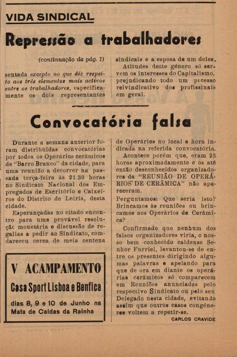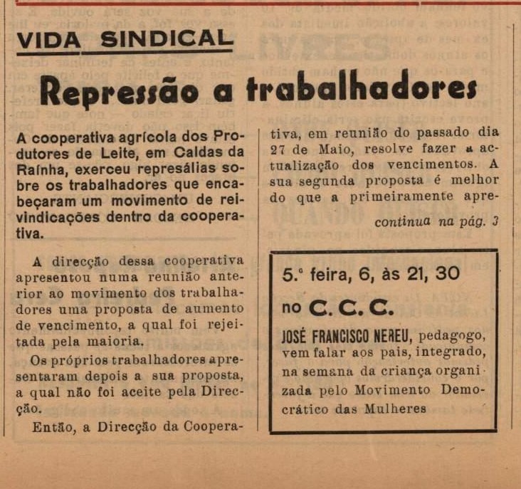 Na vida sindical destaque para a “repressão a trabalhadores”. É que “a cooperativa agrícola dos Produtores de Leite, em Caldas da Rainha, exerceu represálias sobre os trabalhadores que encabeçaram um movimento de reivindicações dentro da cooperativa. A direcção dessa cooperativa apresentou numa reunião anterior ao movimento dos trabalhadores uma proposta de aumento de vencimento, a qual foi rejeitada pela maioria. Os próprios trabalhadores apresentaram depois a sua proposta, a qual não foi aceite pela Direcção. Então, a Direcção da Cooperativa, em reunião do passado dia 27 de Maio, resolve fazer a actualização dos vencimentos. A sua segunda proposta é melhor do que a primeiramente apresentada excepto no que diz respeito aos três elementos mais activos entre os trabalhadores, especificamente os dois representantes sindicais e a esposa de um deles. Atitudes deste género só servem os interesses do Capitalismo, prejudicando todo um processo reivindicativo dos profissionais em geral”.