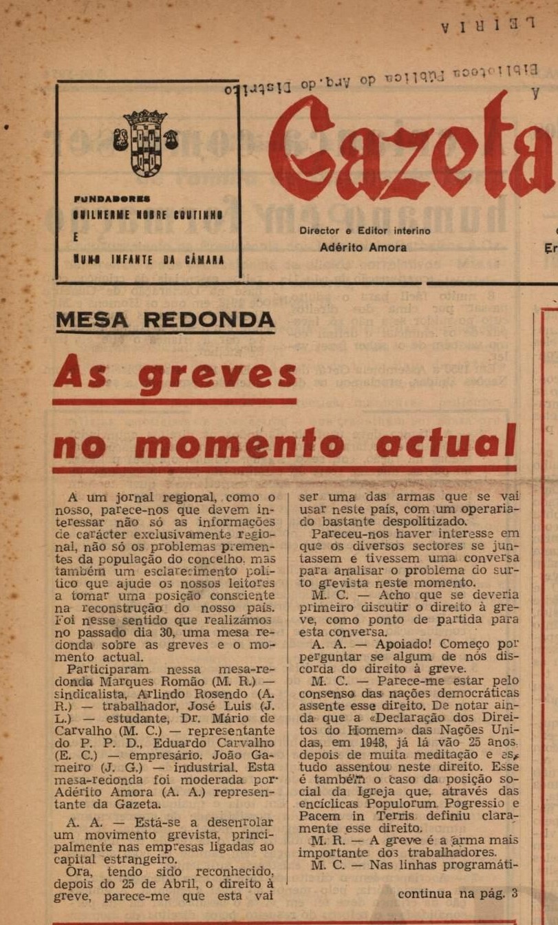“As greves no momento actual”, é o título de uma peça que diz que “a um jornal regional, como o nosso, parece-nos que devem interessar não só as informações de carácter exclusivamente regional, não só os problemas prementes da população do concelho, mas também um esclarecimento politico que ajude os nossos leitores a tomar uma posição consciente na reconstrução do nosso pais. Foi nesse sentido que realizámos no passado dia 30, uma mesa redonda sobre as greves e o momento actual. Participaram nessa mesa-redonda Marques Romão (M. R.) sindicalista, Arlindo Rosendo (A.R.) trabalhador, José Luis (J.L.) estudante, Dr. Mário de Carvalho (M. C.) representante do P. P. D., Eduardo Carvalho (E. C.) empresário. João Gameiro (J. G.) industrial, Esta mesa-redonda foi moderada por Adérito Amora (A. A.) representante da Gazeta.