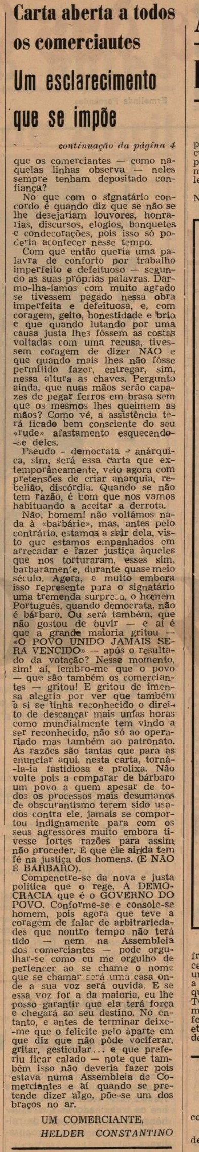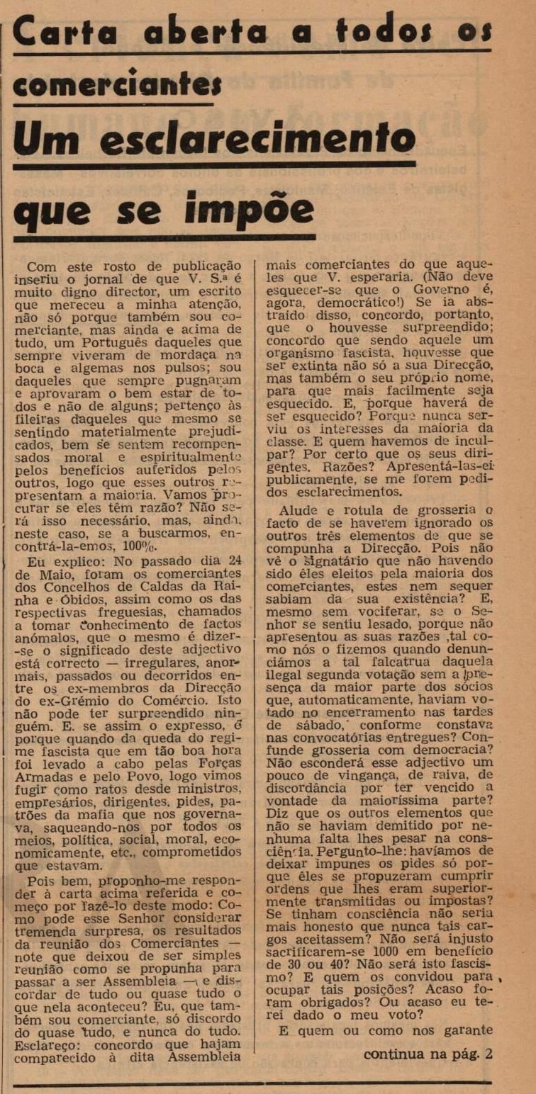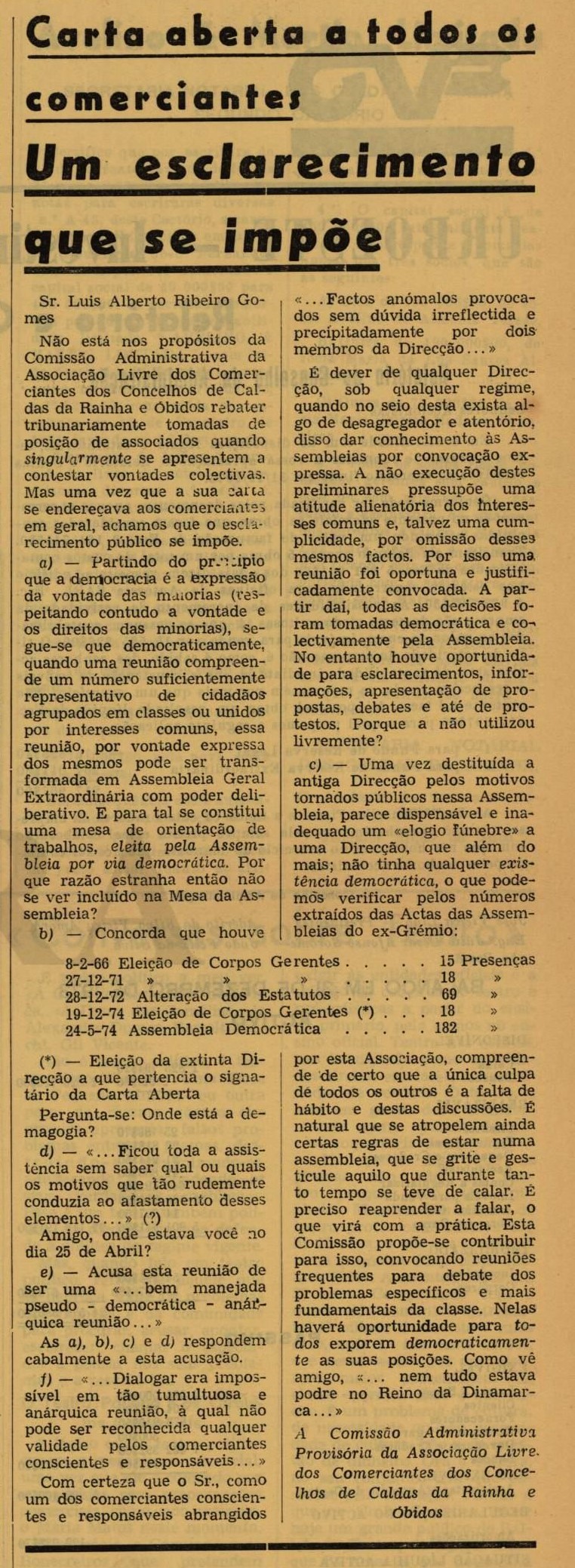 Esta semana continuava a polémica relativa aos comerciantes na cidade das Caldas, com uma nova carta, agora de Hélder Constantino. “Com este rosto de publicação inseriu o jornal de que V. S.a é muito digno director, um escrito que mereceu a minha atenção, não só porque também sou comerciante, mas ainda e acima de tudo, um Português daqueles que sempre viveram de mordaça na boca e algemas nos pulsos; sou daqueles que sempre pugnaram e aprovaram o bem estar de todos e não de alguns; pertenço às fileiras daqueles que mesmo se sentindo materialmente prejudicados, bem se sentem recompensados moral e espiritualmente pelos benefícios auferidos pelos outros, logo que esses outros representam a maioria. Vamos procurar se eles têm razão? Não será isso necessário, mas, ainda. neste caso, se a buscarmos, encontrá-la-emos, 100%. Eu explico: No passado dia 24 de Maio, foram os comerciantes dos Concelhos de Caldas da Rainha e Óbidos, assim como os das respectivas freguesias, chamados a tomar conhecimento de factos anomalos, que o mesmo é dizer-se o significado deste adjectivo está correcto – irregulares, anormais, passados ou decorridos entre os ex-membros da Direcção do ex-Grémio do Comércio. Isto não pode ter surpreendido ninguém. E. se assim o expresso, é porque quando da queda do regime fascista que em tão boa hora foi levado a cabo pelas Forças Armadas e pelo Povo, logo vimos fugir como ratos desde ministros, empresários, dirigentes, pides, patrões da mafia que nos governava, saqueando-nos por todos os meios, política, social, moral, economicamente, etc., comprometidos que estavam. Pois bem, proponho-me responder à carta acima referida e começo por fazê-lo deste modo: Como pode esse Senhor considerar tremenda surpresa, os resultados da reunião dos Comerciantes note que deixou de ser simples reunião como se propunha para passar a ser Assembleia e discordar de tudo ou quase tudo o que nela aconteceu? Eu, que também sou comerciante, só discordo do quase tudo, e nunca do tudo. Esclareço: concordo que hajam comparecido à dita Assembleia mais comerciantes do que aqueles que V. esperaria. (Não deve esquecer-se que o Governo é, agora, democrático!) Se ia abstraído disso, concordo, portanto, que o houvesse surpreendido; concordo que sendo aquele um organismo fascista, houvesse que ser extinta não só a sua Direcção, mas também o seu próprio nome, para que mais facilmente seja esquecido. E, porque haverá de ser esquecido? Porque nunca serviu os interesses da maioria da classe. E quem havemos de inculpar? Por certo que os seus dirigentes. Razões? Apresentá-las-ei publicamente, se me forem pedidos esclarecimentos. Alude e rotula de grosseria o facto de se haverem ignorado os outros três elementos de que se compunha a Direcção. Pois não vê o signatário que não havendo sido êles eleitos pela maioria dos comerciantes, estes nem sequer sabiam da da sua existência? E, mesmo sem vociferar, se o Senhor se sentiu lesado, porque não apresentou as suas razões,tal como nós o fizemos quando denunciámos a tal falcatrua daquela ilegal segunda votação sem a presença da maior parte dos sócios que, automaticamente, haviam votado no encerramento nas tardes de sábado, conforme constava nas convocatórias entregues? Confunde grosseria com democracia? Não esconderá esse adjectivo um pouco de vingança, de raiva, de discordância por ter vencido a vontade da maiorissima parte? Diz que os outros elementos que não se haviam demitido por nenhuma falta lhes pesar na consciência. Pergunto-lhe: havíamos de deixar impunes os pides só porque éles se propuzeram cumprir ordens que lhes eram superiormente transmitidas ou impostas? Se tinham consciência não seria mais honesto que nunca tais cargos aceitassem? Não será injusto sacrificarem-se 1000 em benefício de 30 ou 40? Não será isto fascismo? E quem os convidou para, ocupar tais posições? Acaso foram obrigados? Ou acaso eu terei dado o meu voto? E quem ou como nos garante que os comerciantes como na quelas linhas observa – neles sempre tenham depositado confiança? No que com o signatário concordo é quando diz que se não se lhe desejariam louvores, honrarias, discursos, elogios, banquetes e condecorações, pois isso só poderia acontecer nesse tempo. Com que então queria uma palavra de conforto por trabalho imperfeito e defeituoso segundo as suas próprias palavras. Dar-mo-lha-íamos com muito agrado, se tivessem pegado nessa obra imperfeita e defeituosa, e, com coragem, geito, honestidade e brio e que quando lutando por uma causa justa lhes fôssem as costas voltadas com uma recusa, tivessem coragem de dizer NÃO e que quando mais lhes não fosse permitido fazer, entregar, sim, nessa altura as chaves. Pergunto ainda, que nuas mãos serão capazes de pegar ferros em brasa sem que os mesmos lhes queimem as mãos? Como vê, a assistência terá ficado bem consciente do seu «rude» afastamento esquecendo-se deles. Pseudo- democrata anárquica, sim, será essa carta que extemporâneamente, veio agora com pretensões de criar anarquia, rebelião, discórdia. Quando se não tem razão, é bom que nos vamos habituando a aceitar a derrota. Não, homem! não voltámos nada à «barbárie», mas, antes pelo contrário, estamos a sair dela, visto que estamos empenhados em arrecadar e fazer justiça àqueles que nos torturaram, esses sim, barbaramente, durante quase meio século. Agora, e muito embora isso represente para o signatário uma tremenda surpresa, o homem Português, quando democrata, não é bárbaro. Ou será também, que não gostou de ouvir e aí é que a grande maioria gritou «O POVO UNIDO JAMAIS SERÁ VENCIDO» após o resultado da votação? Nesse momento, sim! aí, lembro-me que o povo que são também os comerciantes gritou! E gritou de imensa alegria por ver que também a si se tinha reconhecido o direito de descançar mais umas horas como mundialmente tem vindo a ser reconheci