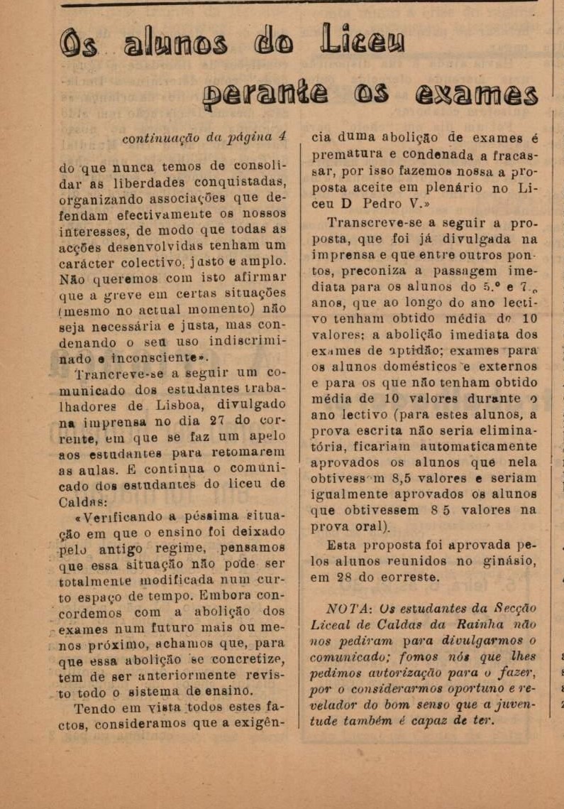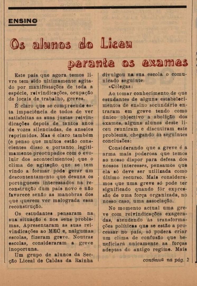 “Os alunos do Liceu perante os exames” dá título a um artigo que recorda que “este país que agora temos livre tem sido ultimamente agitado por manifestações de toda a espécie, reivindicações, ocupação de locais de trabalho, greves. É claro que se compreende esta impaciência de todos de ver satisfeitas as suas justas reivindicações depois de tantos anos de vozes silenciadas, de anseios reprimidos. Mas é claro também (e penso que muitos estão conscientes disso e portanto legitimamente preocupados com o evoluir dos acontecimentos) que o clima de agitação que se tem vindo a formar pode gerar um descontentamento que desuna os portugueses interessados na reconstrução dum país novo e não favorece senão as manobras dos que querem ver malograda essa reconstrução. Os estudantes pensaram na sua situação e nos seus problemas. Apresentaram as suas reivindicações ao MEC e, nalgumas escolas, fizeram greve. Noutras escolas, consideraram a greve inoportuna. Um grupo de alunos da Secção Liceal de Caldas da Rainha divulgou na sua escola o comunicado seguinte: “Colegas: Ao tomar conhecimento de que estudantes de alguns estabelecimentos de ensino secundário entraram em greve tendo como único objectivo a abolição dos exames, alguns alunos deste liceu reuniram e discutiram este problema, chegando às seguintes conclusões: Considerando que a greve é a arma mais poderosa que temos ao nosso dispor para defesa dos nossos interesses, pensamos que ela só deve ser utilizada como último recurso. Mais consideramos que uma greve só pode ter significado quando for expressão de uma força organizada, no nosso caso, uma associação. No momento actual uma greve com reivindicações exageradas, atendendo às transformações políticas que se estão a processar no país, só poderá criar um clima de confusão que beneficiará unicamente as forças adeptas do antigo regime. Mais do que nunca temos de consolidar as liberdades conquistadas, organizando associações que defendam efectivamente os nossos interesses, de modo que todas as acções desenvolvidas tenham um carácter colectivo, justo e amplo. Não queremos com isto afirmar que a greve em certas situações (mesmo no actual momento) não seja necessária e justa, mas condenando o seu uso indiscriminado e inconsciente.. Trancreve-se a seguir um comunicado dos estudantes trabalhadores de Lisboa, divulgado na imprensa no dia 27 do corrente, em que se faz um apelo aos estudantes para retomarem as aulas. E continua o comunicado dos estudantes do liceu dos estudantes do liceu de Caldas: «Verificando a péssima situação em que o ensino foi deixado pelo antigo regime, pensamos que essa situação não pode ser totalmente modificada num curto espaço de tempo. Embora concordemos com a abolição dos exames num futuro mais ou menos próximo, achamos que, para que essa abolição se concretize, tem de ser anteriormente revisto todo o sistema de ensino. Tendo em vista todos estes factos, consideramos que a exigência duma abolição de exames é prematura e condenada a fracassar, por isso fazemos nossa a proposta aceite em plenário no Liceu D Pedro V.» Transcreve-se a seguir a proposta, que foi já divulgada na imprensa e que entre outros pontos, preconiza a passagem imediata para os alunos do 5.° e 7º anos, que ao longo do ano lectivo tenham obtido média do 10 valores; a abolição imediata dos exames de aptidão; exames para os alunos domésticos e externos e para os que não tenham obtido média de 10 valores durante o ano lectivo (para estes alunos, a prova escrita não seria eliminatória, ficariam automaticamente aprovados os alunos que nela obtivessem 8,5 valores e seriam igualmente aprovados os alunos que obtivessem 8,5 valores na prova oral). Esta proposta foi aprovada pelos alunos reunidos no ginásio, em 28 do corrente”, lê-se na peça que termina com uma nota: “os estudantes da Secção Liceal de Caldas da Rainha não nos pediram para divulgarmos o comunicado; fomos nós que lhes pedimos autorização para o fazer, por o considerarmos oportuno e revelador do bom senso que a juventude também é capaz de ter”.