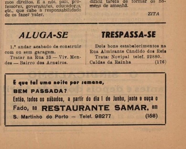 “E que tal uma noite por semana, BEM PASSADA? Então, todos os sábados, a partir do dia 1 de Junho, jante e ouça o Fado, no RESTAURANTE SAMAR, em S. Martinho do Porto Telef. 98277”, lê-se num anúncio.Esta semana a Gazeta apresenta mais um cartoon, também da autoria de Figueiredo Sobral.