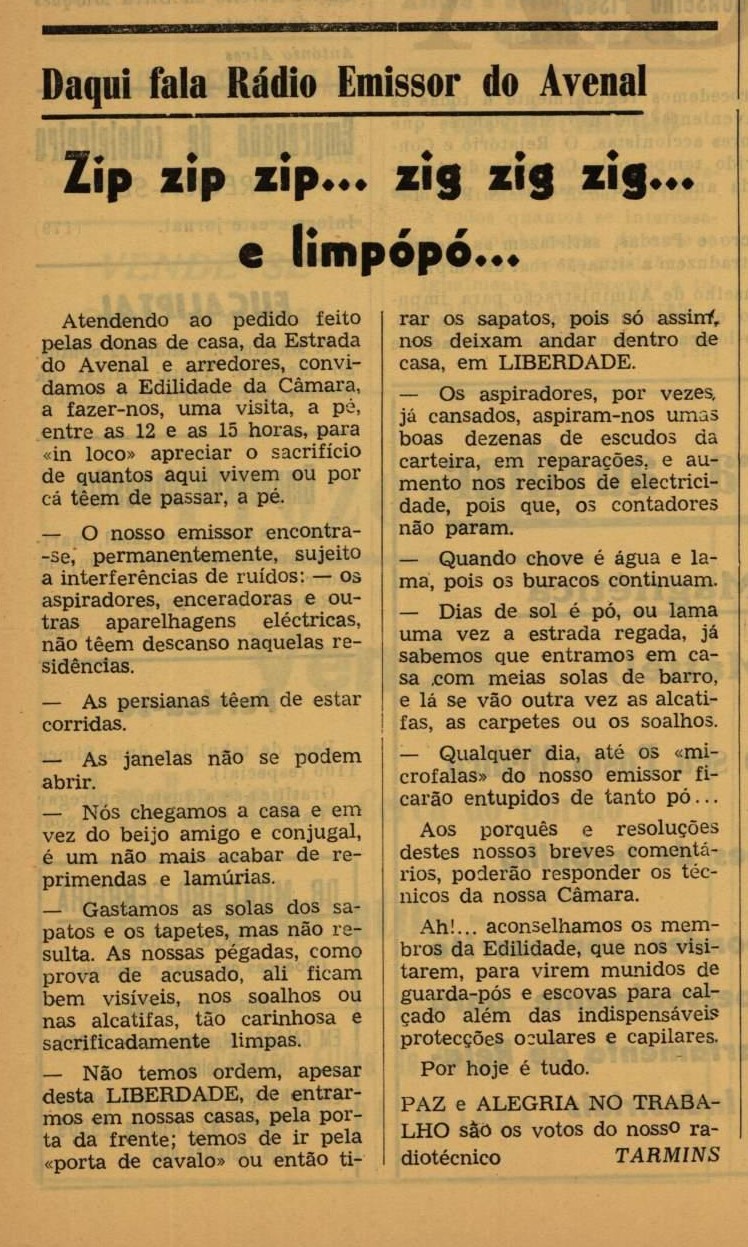“Daqui fala Rádio Emissor do Avenal zip zip zip… zig zig zig… e limpópó…”, começa mais uma crónica que expõe a situação que se vivia no Avenal. “Atendendo ao pedido feito pelas donas de casa, da Estrada do Avenal e arredores, convidamos a Edilidade da Câmara, a fazer-nos, uma visita, a pé, entre as 12 e as 15 horas, para «in loco» apreciar o sacrifício de quantos aqui vivem ou por cá têem de passar, a pé. O nosso emissor encontra–se, permanentemente, sujeito a interferências de ruídos: -os aspiradores, enceradoras e outras aparelhagens eléctricas, não têem descanso naquelas residências. As persianas têem de estar corridas. As janelas não se podem abrir. Nós chegamos a casa e em vez do beijo amigo e conjugal, é um não mais acabar de reprimendas e lamúrias. Gastamos as solas dos sapatos e os tapetes, mas não resulta. As nossas pégadas, como prova de acusado, ali ficam bem visíveis, nos soalhos ou nas alcatifas, tão carinhosa e sacrificadamente limpas. Não temos ordem, apesar desta LIBERDADE, de entrarmos em nossas casas, pela porta da frente; temos de ir pela «porta de cavalo» ou então tirar os sapatos, pois só assim, nos deixam andar dentro de casa, em LIBERDADE. Os aspiradores, por vezes, já cansados, aspiram-nos umas boas dezenas de escudos da carteira, em reparações, e aumento nos recibos de electricidade, pois que, os contadores não param. Quando chove é água e lama, pois os buracos continuam. Dias de sol é pó, ou lama uma vez a estrada regada, já sabemos que entramos em casa com meias solas de barro, e lá se vão outra vez as alcatifas, as carpetes ou os soalhos. Qualquer dia, até os «microfalas» do nosso emissor ficarão entupidos de tanto pó… Aos porquês e resoluções destes nossos breves comentários, poderão responder os técnicos da nossa Câmara. Ah!… aconselhamos os membros da Edilidade, que nos visitarem, para virem munidos de guarda-pós e escovas para calçado além das indispensáveis protecções oculares e capilares. Por hoje é tudo. PAZ e ALEGRIA NO TRABALHO são os votos do nosso radiotécnico”.