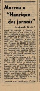 Com 67 anos de idade faleceu, nesta cidade, Henrique de Oliveira Vilão, popular «Henrique dos Jornais»; vítima de cansaço e velhice, consequências da dura e violenta tarefa de vender jornais, a que desde muito novo se entregou e a qual só deixou de exercer agora, que faleceu. Desde os 9 anos de idade que não conheceu outra profissão que não fosse a de ardina. Com mais alguns anos, começou a vender no comboio entre Lisboa e Figueira da Foz. Fazia duas viagens por dia ida e volta. À volta ficava nas Caldas onde efectuava a venda dos jornais da noite, após a qual seguia, de novo, para Lisboa, donde regressava no dia seguinte trazendo os jornais para a população caldense. Foi, portanto, durante muitos anos o único elo de ligação entre as redacções dos jornais e a população desta cidade. Embora diariamente transportasse milhões de letras, milhares de palavras, debaixo de braço, Henrique Vilão, nunca teve a possibilidade de as saber associar e decifrar o seu significado, pois o facto de, muito novo – com 9 anos – ter começado a trabalhar, impediu-o de ingressar na instrução primária. Há cerca de dois anos – vítima de atropelamento esteve internado no Hospital desta cidade em consequência de fractura das duas pernas, tendo pago com as suas economias tudo!! Voltou novamente à venda, passado algum tempo, e não pudemos, nessa altura deixar de ir ao seu encontro, para saber concretamente a razão ou razões do seu regresso à venda: