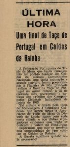 “A Federação Portuguesa de Ténis de Mesa, que tanto lamentou não ter podido realizar em Caldas os últimos Campeonatos Nacionais, que tanta animação e grande proveito foram proporcionar à Figueira da Foz, pretende realizar a final da Taça de Portugal na nossa cidade, a 27 do corrente mês, precedendo a entrega dos prémios dos Campeonatos Distritais Individuais de Leiria de 1973. Tal atitude é ditada pela ideia de homenagem à Comissão Caldense que agora dirige a Associação de Ténis de Mesa do Distrito de Leiria, agora com sede nesta cidade, e aos clubes e jogadores caldenses que tanto se dedicam e valem no Ping-Pong. Esperamos que não se perderá esta oportunidade de bem colocar as Caldas da Rainha… A Gazeta auxiliará quanto seja necessário!”, lê-se nas páginas do jornal caldense.