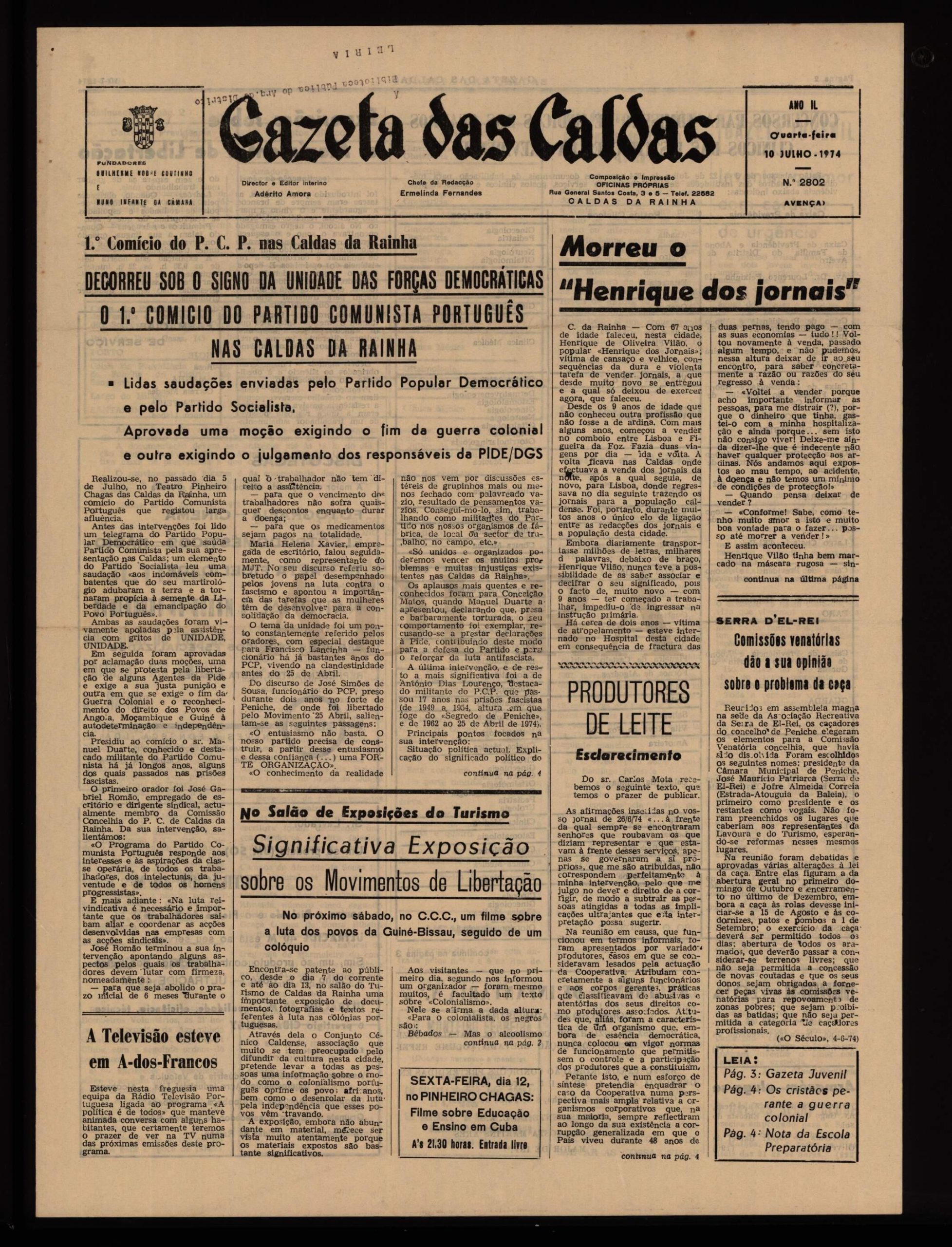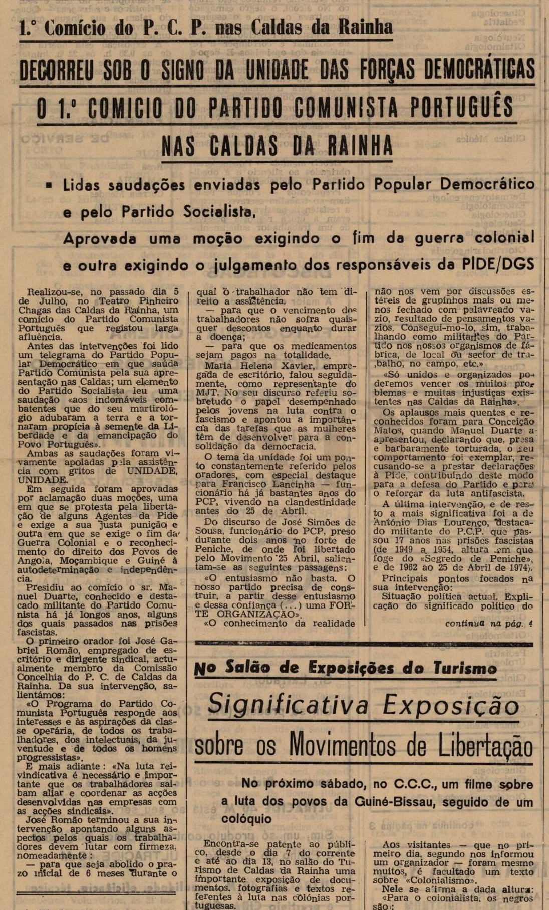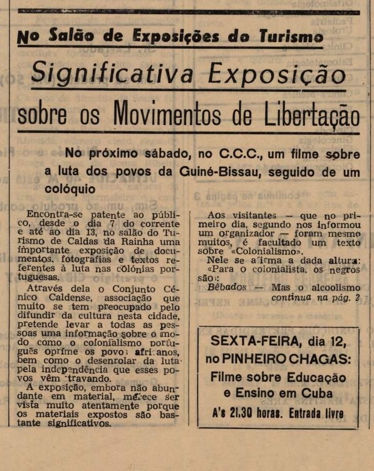 Esta semana destaque na Gazeta das Caldas para uma grande exposição sobre o Movimentos de Libertação na cidade, organizada pelo Conjunto Cénico Caldense. O evento decorreu no Salão de Turismo e na edição do dia 6 temos o anúncio, que termina com: “Não faltes – Traz um amigo”.