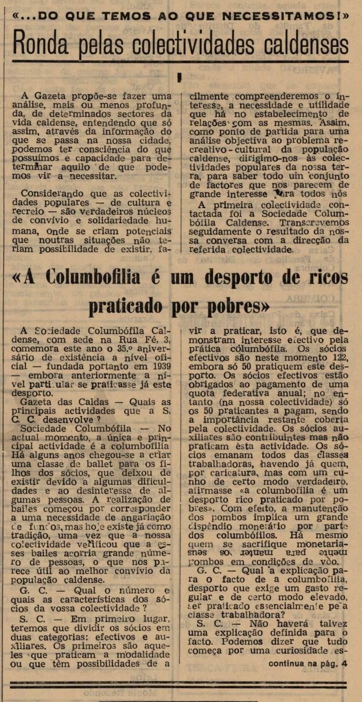 “A Gazeta propõe-se fazer uma análise, mais ou menos profunda, de determinados sectores da vida caldense, entendendo que só assim, através da informação do que se passa na nossa cidade, podemos ter consciência do que possuímos e capacidade para determinar aquilo de que podemos vir a necessitar. Considerando que as colectividades populares de cultura e recreio são verdadeiros núcleos de convívio e solidariedade humana, onde se criam potenciais que noutras situações não teriam possibilidade de existir, facilmente compreenderemos o interesse, a necessidade e utilidade que há no estabelecimento de relações com as mesmas. Assim, como ponto de partida para uma análise objectiva ao problema recreativo-cultural da população caldense, dirigimo-nos às colectividades populares da nossa terra, para saber todo um conjunto de factores que nos parecem de grande interesse para todos nós”, explicam os responsáveis do jornal.