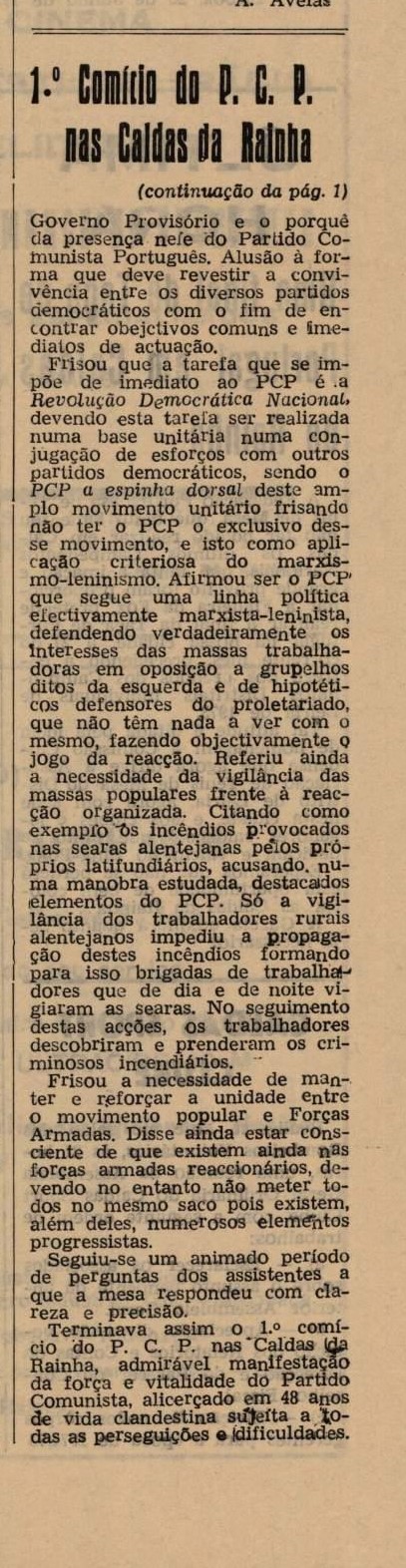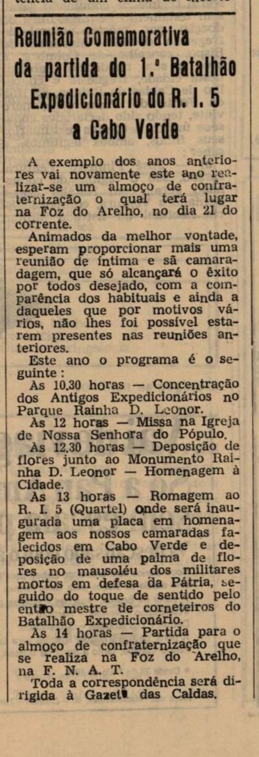 Nota ainda para a intensa atividade sindical na região, para a realização da reunião comemorativa da partida do 1º Batalhão Expedicionário do R.I.5 a Cabo Verde, com a homenagem à cidade, com a deposição de uma coroa de flores na estátua da Rainha, a inauguração de uma placa no quartel, em homenagem aos nossos camaradas falecidos em Cabo Verde e deposição de uma palma de flores no mausoléu dos militares mortos em defesa da Pátria, antes de um almoço de confraternização na F.N.A.T. – hoje INATEL -, na Foz do Arelho.