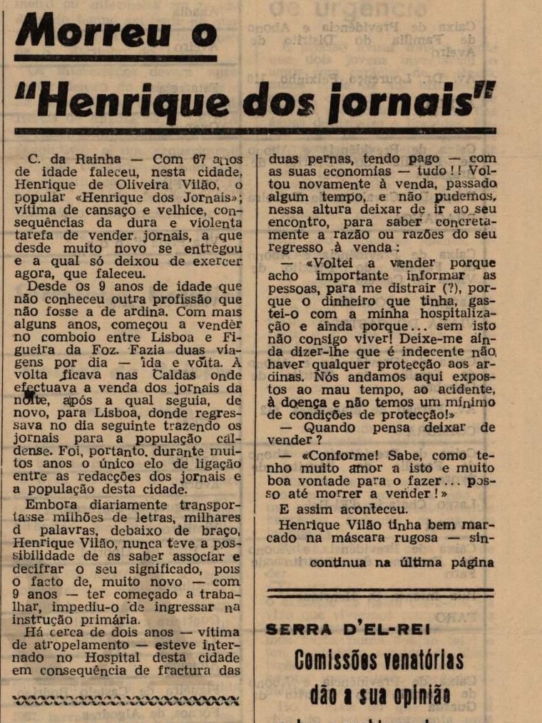 Com 67 anos de idade faleceu, nesta cidade, Henrique de Oliveira Vilão, popular «Henrique dos Jornais»; vítima de cansaço e velhice, consequências da dura e violenta tarefa de vender jornais, a que desde muito novo se entregou e a qual só deixou de exercer agora, que faleceu. Desde os 9 anos de idade que não conheceu outra profissão que não fosse a de ardina. Com mais alguns anos, começou a vender no comboio entre Lisboa e Figueira da Foz. Fazia duas viagens por dia ida e volta. À volta ficava nas Caldas onde efectuava a venda dos jornais da noite, após a qual seguia, de novo, para Lisboa, donde regressava no dia seguinte trazendo os jornais para a população caldense. Foi, portanto, durante muitos anos o único elo de ligação entre as redacções dos jornais e a população desta cidade. Embora diariamente transportasse milhões de letras, milhares de palavras, debaixo de braço, Henrique Vilão, nunca teve a possibilidade de as saber associar e decifrar o seu significado, pois o facto de, muito novo – com 9 anos – ter começado a trabalhar, impediu-o de ingressar na instrução primária. Há cerca de dois anos – vítima de atropelamento esteve internado no Hospital desta cidade em consequência de fractura das duas pernas, tendo pago com as suas economias tudo!! Voltou novamente à venda, passado algum tempo, e não pudemos, nessa altura deixar de ir ao seu encontro, para saber concretamente a razão ou razões do seu regresso à venda: