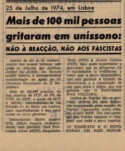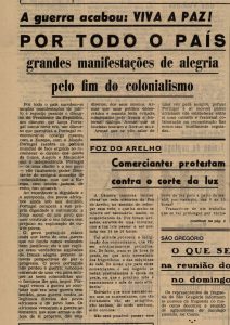 “A guerra acabou: VIVA A PAZ! Por todo o país grandes manifestações de alegria pelo fim do colonialismo” é o título de um artigo na primeira página da Gazeta das Caldas do dia 31.