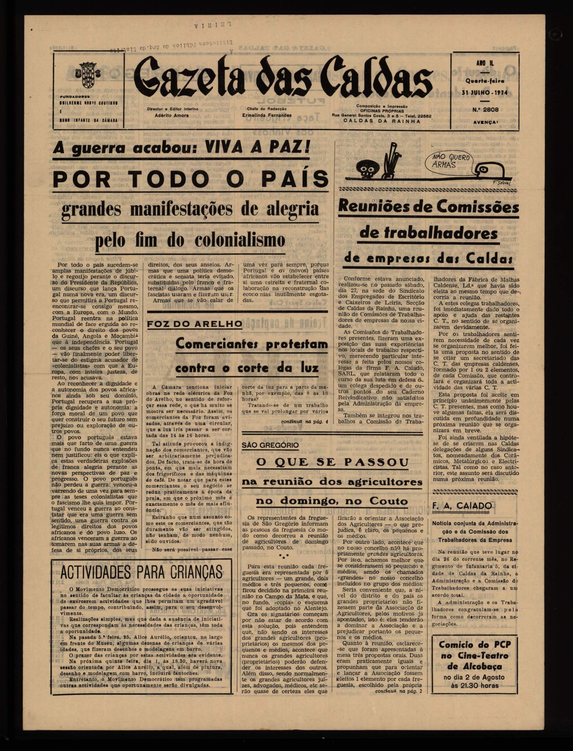 “A guerra acabou: VIVA A PAZ! Por todo o país grandes manifestações de alegria pelo fim do colonialismo” é o título de um artigo na primeira página da Gazeta das Caldas do dia 31.