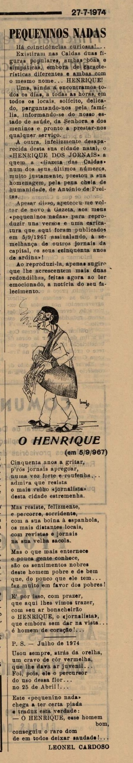 “Há coincidências curiosas! Existiram nas Caldas duas figuras populares, ambas boas e simpáticas, embora de características diferentes e ambas com o mesmo nome… HENRIQUE! Uma, ainda a encontramos todos os dias, a todas as horas, em todos os locais. solícito, delicado, perguntando-nos pela família, informando-se do nosso estado de saúde, da Senhora e dos meninos e pronto a prestar-nos qualquer serviço. A outra, infelizmente desaparecida desta sua cidade natal, o HENRIQUE DOS JORNAIS a quem a «Gazeta das Caldas» num dos seus últimos números, muito justamente, prestou a sua homenagem, pela pena cheia de humanidade, de António João Freitas. Apesar disso, apeteceu-me voltar de novo à Gazeta, aos meus pequeninos nadas para reproduzir uns versos e uma caricatura que aqui foram publicados em 5/9/1967 assinalando, à semelhança de outros jornais da capital, os seus cinquenta anos de ardina! Ao reproduzi-la, apenas sugiro que lhe acrescentem mais duas redondilhas, feitas agora ao ler emocionado, a notícia do seu falecimento”, lê-se, antes de um poema: