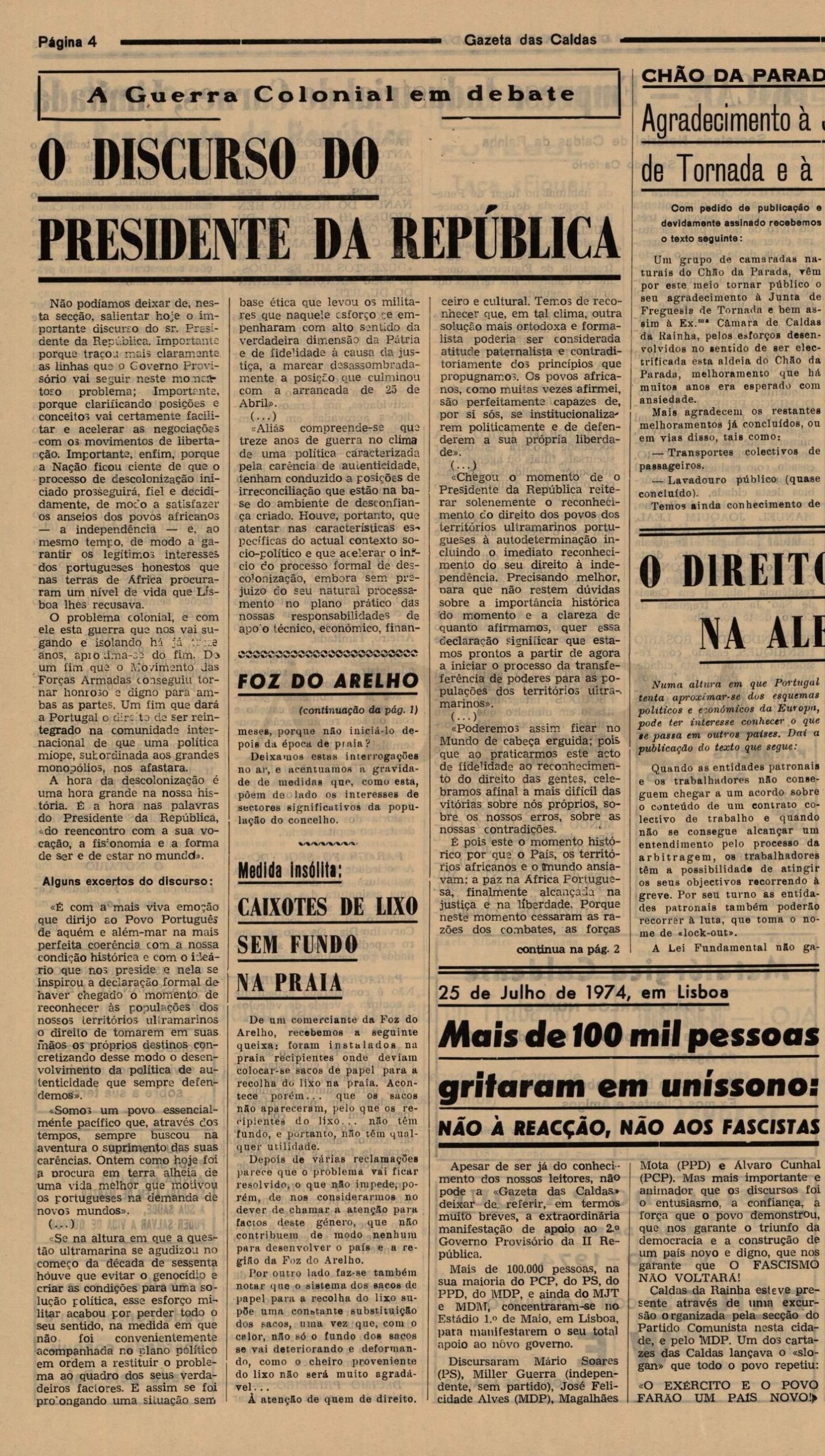 “Não podíamos deixar de, nesta secção, salientar hoje o importante discurso do sr. Presidente da República. importante porque traço mais claramente as linhas que o Governo Provisório vai seguir neste momentoso problema; Importante, porque clarificando posições e conceitos vai certamente facilitar e acelerar as negociações com os movimentos de libertação. Importante, enfim, porque a Nação ficou ciente de que o processo de descolonização iniciado prosseguirá, fiel e decididamente, de modo a satisfazer os anseios dos povos africanos: a independência e, ao mesmo tempo, de modo a garantir os legítimos interesses dos portugueses honestos que nas terras de Africa procuraram um nível de vida que Lisboa lhes recusava. O problema colonial, e com ele esta guerra que nos vai sugando e isolando há já treze anos, aproxima-se do fim. Do um fim que o Movimento das Forças Armadas conseguiu tornar honroso e digno para ambas as partes. Um fim que dará a Portugal o direito de ser reintegrado na comunidade internacional de que uma política míope, subordinada aos grandes monopólios, nos afastara. A hora da descolonização é uma hora grande na nossa história. É a hora nas palavras do Presidente da República, do reencontro com a sua vocação, a fisionomia e a forma de ser e de estar no mundo”, lê-se no artigo que publica alguns excertos do discurso:
