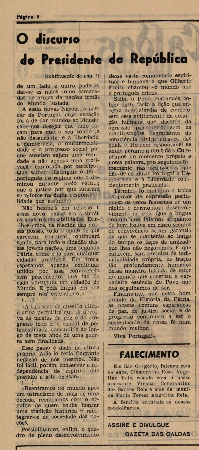 “A salvação da questão ultramarina permitirá que se devolva às tarefas da paz e do progresso todo esse caudal de potencialidade, consumido ao longo de treze anos de uma guerra sem finalidade. Esse passo é dado na altura própria. Adiá-lo seria flagrante negação de nós mesmos. Não foi fácil, porém, conservar a independência de espírito que presidiu a esta decisão». (…) «Reentramos no mundo após um ostracismo de mais de uma década, reentramos com o orgulho de quem soube honrar uma tradição histórica e reintegrar-se na sociedade das nações. Possibilitamos, enfim, o quadro de pleno desenvolvimento dessa vasta comunidade espiritual e humana a que Gilberto Freire chamou o mundo que o português criou». Saiba o Povo Português colher deste facto a lição que encerra sem alardes de comício sem esse aviltamento da condição humana que decorre da agressão psicológica, sem as manifestações degradantes da consciência cívica através das quais o Homem responsável se anula perante a multidão. Cumprimos no momento próprio a nossa palavra, prosseguindo firmemente nas realizações que hão-de conduzir Portugal à Democracia e à Liberdade conscientemente praticadas. Termino formulando a todos os povos de expressão portuguesa os votos fraternos de um rápido e harmonioso desenvolvimento na Paz. Que a língua comum que falamos e quanto de bom houve em cinco séculos de convivência sejam garantia de que se manterão ao longo do tempo os laços de amizade que lhes não negaremos. E que cultivem, sem prejuízo de individualidade própria, os traços tão profundamente humanos dessa maneira lusíada de estar no mundo que constitui a verdadeira essência do Povo que nos orgulhamos de ser. Finalmente, que nesta hora grande da História da Pátria, as nossas comuns esperanças de paz, de justiça social e de progresso continuem a ser o sustentáculo da nossa fé num mundo melhor. Viva Portugal!», terminava a transcrição.