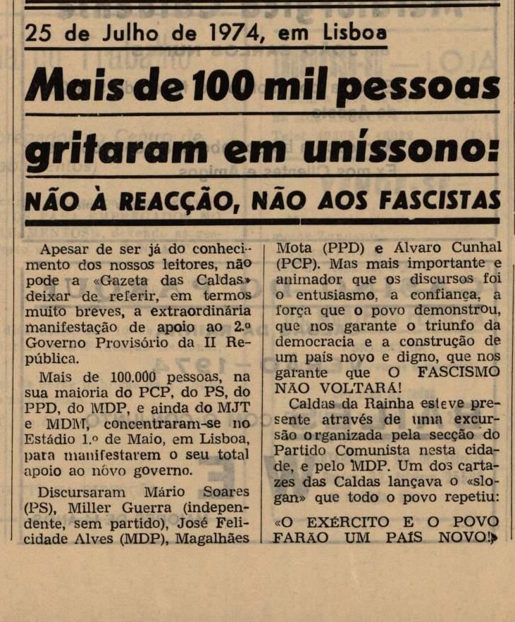 O jornal da terra notava ainda que “Caldas da Rainha esteve presente através de uma excursão organizada pela secção do Partido Comunista nesta cidade, e pelo MDP. Um dos cartazes das Caldas lançava o «slogan» que todo o povo repetiu: «O EXÉRCITO E O POVO FARÃO UM PAIS NOVO!”.