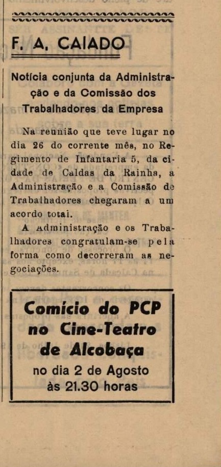 “Na reunião que teve lugar no dia 26 do corrente mês, no Regimento de Infantaria 5, da cidade de Caldas da Rainha, a Administração e a Comissão de Trabalhadores chegaram a um acordo total. A Administração e os Trabalhadores congratulam-se pela forma como decorreram as negociações”, lê-se.