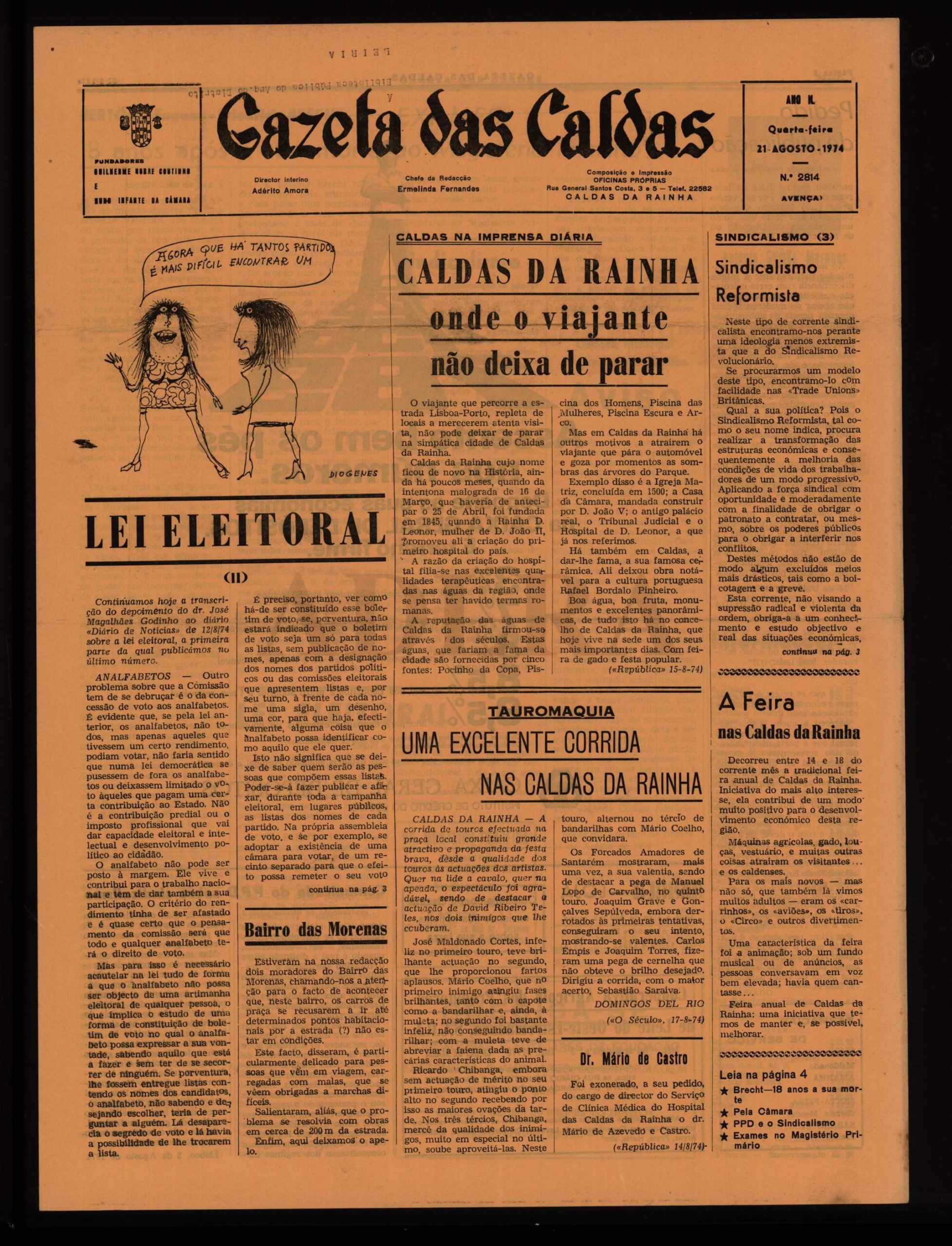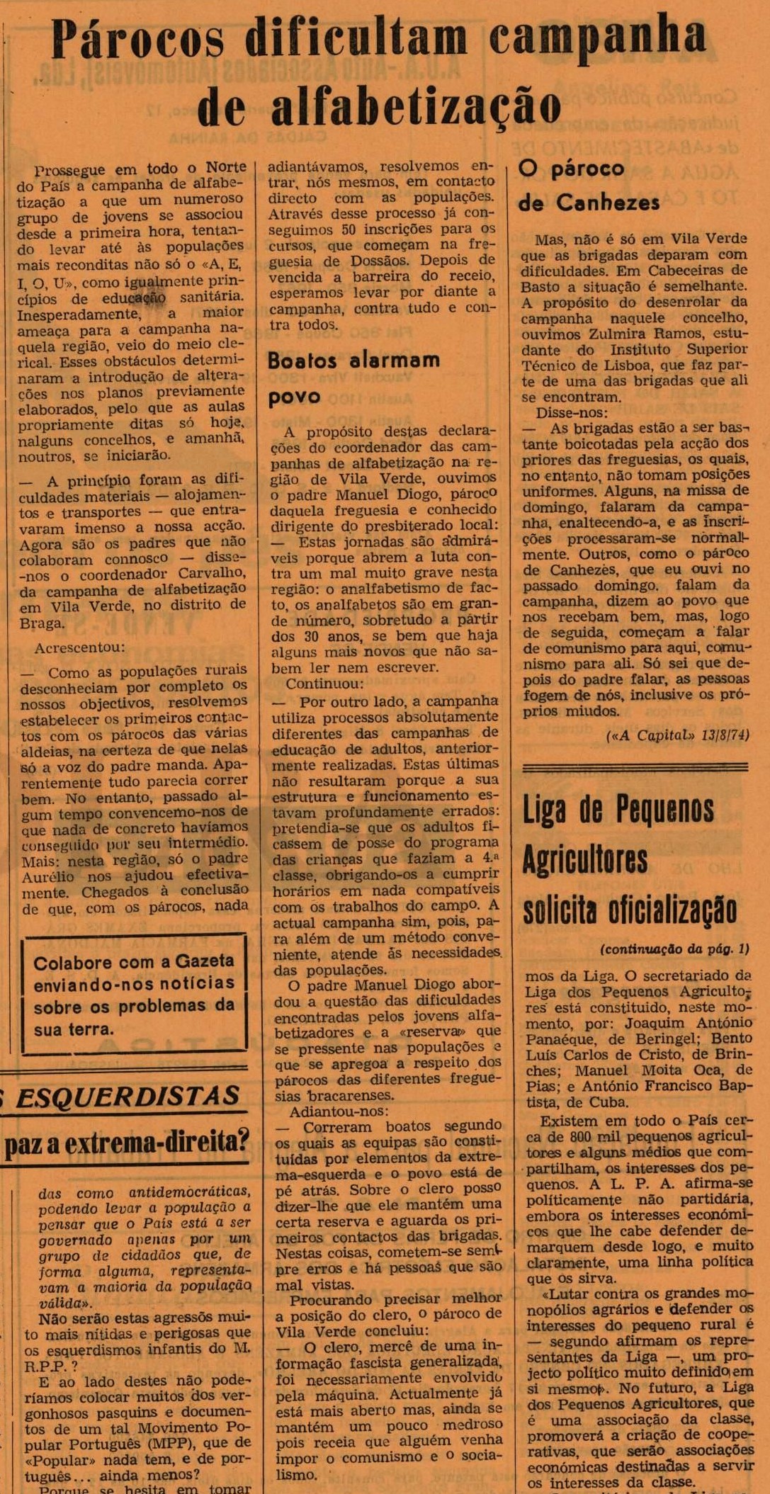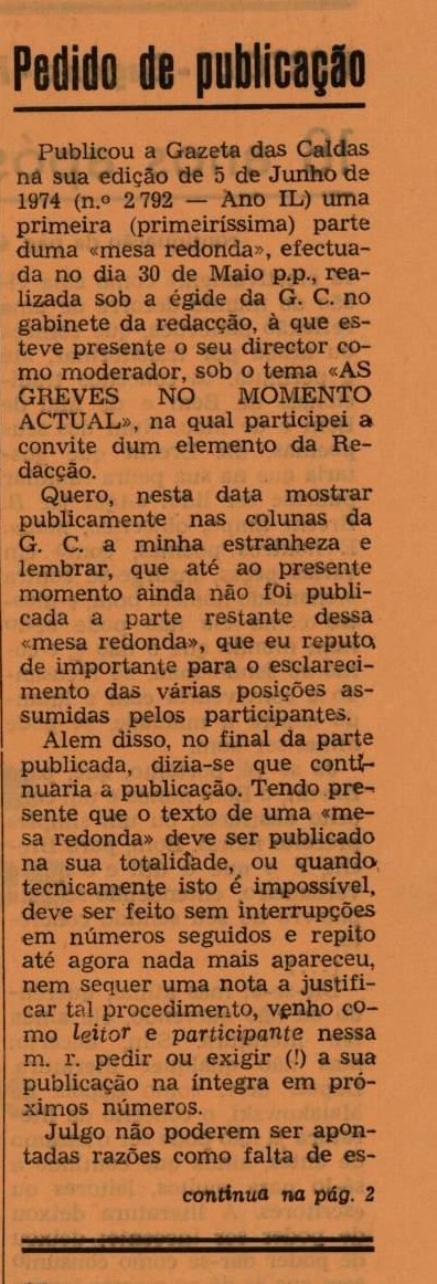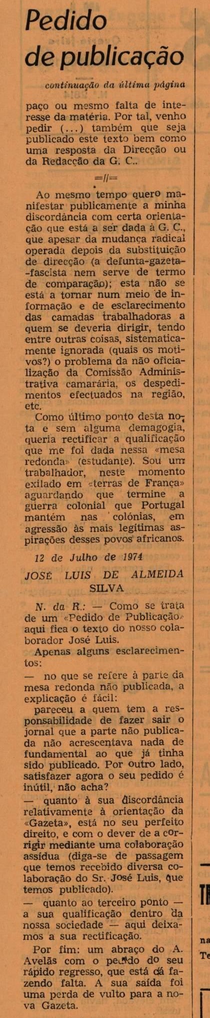 Encontramos ainda um pedido de publicação do atual diretor da Gazeta das Caldas, José Luís de Almeida Silva que manifesta “publicamente a minha discordância com certa orientação que está a ser dada à G.C., que apesar da mudança radical operada depois da substituição de direcção (a defunta-gazeta-fascista nem serve de termo de comparação); esta não se está a tornar num meio de informação e de esclarecimento das camadas trabalhadoras a quem se deveria dirigir, tendo entre outras coisas, sistematicamente ignorada (quais os motivos?) o problema da não oficialização da Comissão Administrativa camarária, os despedimentos efectuados na região, etc. Como último ponto desta nota e sem alguma demagogia, queria rectificar a qualificação que me foi dada nessa «mesa redonda» (estudante). Sou um trabalhador, neste momento exilado em terras de França» aguardando que termine a guerra colonial que Portugal mantém nas colónias, em agressão às mais legítimas aspirações desses povos africanos”.