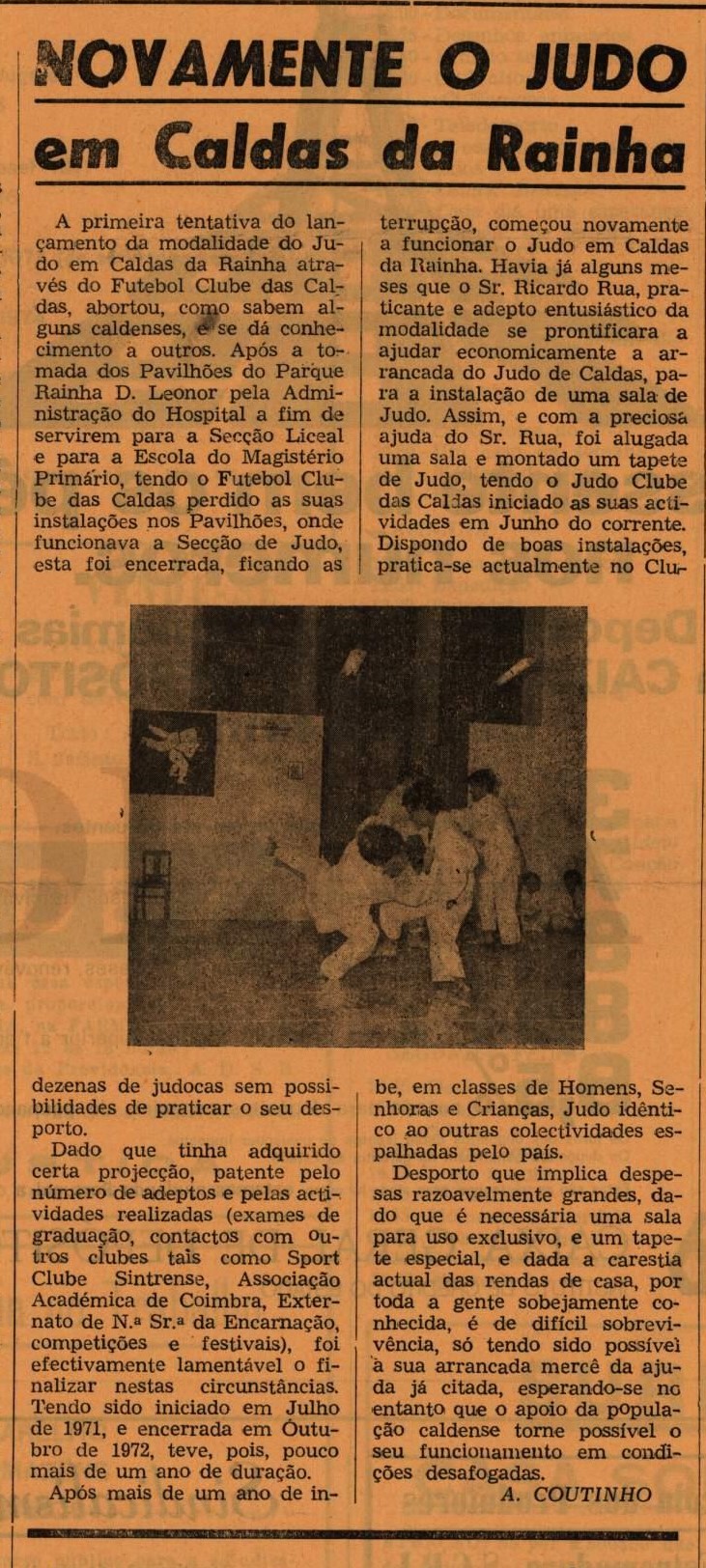 “Após a tomada dos Pavilhões do Parque Rainha D. Leonor pela Administração do Hospital a fim de servirem para a Secção Liceal e para a Escola do Magistério Primário, tendo o Futebol Clube das Caldas perdido as suas instalações nos Pavilhões, onde funcionava a Secção de Judo, esta foi encerrada, ficando as dezenas de judocas sem possibilidades de praticar o seu desporto. Dado que tinha adquirido certa projecção, patente pelo número de adeptos e pelas actividades realizadas (exames de graduação, contactos com outros clubes tais como Sport Clube Sintrense, Associação Académica de Coimbra, Externato de N.a Sr.a da Encarnação, competições e festivais), foi efectivamente lamentável o finalizar nestas circunstâncias. Tendo sido iniciado em Julho de 1971, e encerrada em Outubro de 1972, teve, pois, pouco mais de um ano de duração. Após mais de um ano de interrupção, começou novamente a funcionar o Judo em Caldas da Rainha. Havia já alguns meses que o Sr. Ricardo Rua, praticante e adepto entusiástico da modalidade se prontificara a ajudar economicamente a arrancada do Judo de Caldas, para a instalação de uma sala de Judo. Assim, e com a preciosa ajuda do Sr. Rua, foi alugada uma sala e montado um tapete de Judo, tendo o Judo Clube das Caldas iniciado as suas actividades em Junho do corrente. Dispondo de boas instalações, pratica-se actualmente no Clube, em classes de Homens, Senhoras e Crianças, Judo idêntico ao outras colectividades espalhadas pelo país. Desporto que implica despesas razoavelmente grandes, dado que é necessária uma sala para uso exclusivo, e um tapete especial, e dada a carestia actual das rendas de casa, por toda a gente sobejamente conhecida, é de difícil sobrevivência, só tendo sido possível à sua arrancada mercê da ajuda já citada, esperando-se, no entanto, que o apoio da população caldense torne possível o seu funcionamento em condições desafogadas”.