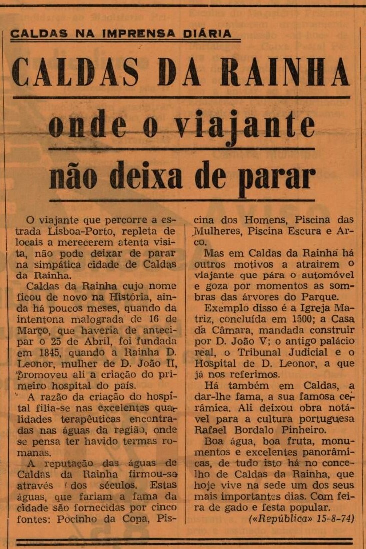 A Gazeta das Caldasrepublica um artigo do jornal “A República”, que afirma que “o viajante que percorre a estrada Lisboa-Porto, repleta de locais a merecerem atenta visita, não pode deixar de parar na simpática cidade de Caldas da Rainha. Caldas da Rainha cujo nome ficou de novo na História, ainda há poucos meses, quando da intentona malograda de 16 de Março, que haveria de antecipar o 25 de Abril, foi fundada em 1845, quando a Rainha D. Leonor, mulher de D. João II, promoveu ali a criação do primeiro hospital do país. A razão da criação do hospital filia-se nas excelentes qualidades terapêuticas encontradas nas águas da região, onde se pensa ter havido termas romanas. A reputação das águas de Caldas da Rainha firmou-se através dos séculos. Estas águas, que fariam a fama da cidade são fornecidas por cinco fontes: Pocinho da Copa, Piscina dos Homens, Piscina das Mulheres, Piscina Escura e Arco. Mas em Caldas da Rainha há outros motivos a atraírem o viajante que pára o automóvel e goza por momentos as sombras das árvores do Parque. Exemplo disso é a Igreja Matriz, concluída em 1500; a Casa da Câmara, mandada construir por D. João V; o antigo palácio real, o Tribunal Judicial e o Hospital de D. Leonor, a que já nos referimos. Há também em Caldas, a dar-lhe fama, a sua famosa cerâmica. Ali deixou obra notável para a cultura portuguesa Rafael Bordalo Pinheiro. Boa água, boa fruta, monumentos e excelentes panorâmicas, de tudo isto há no concelho de Caldas da Rainha, que hoje vive na sede um dos seus mais importantes dias. Com feira de gado e festa popular”.