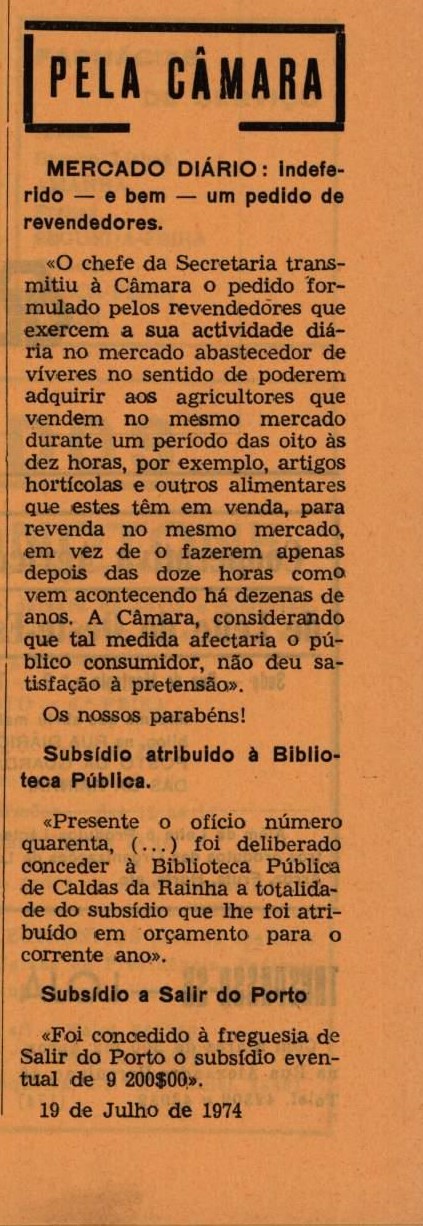 Da Câmara das Caldas vinha a história de um pedido de revendedores da Praça da Fruta que foi indeferido (“e bem” diz o jornal). “O chefe da Secretaria transmitiu à Câmara o pedido formulado pelos revendedores que exercem a sua actividade diária no mercado abastecedor de víveres no sentido de poderem adquirir aos agricultores que vendem no mesmo mercado durante um período das oito às dez horas, por exemplo, artigos hortícolas e outros alimentares que estes têm em venda, para revenda no mesmo mercado, em vez de o fazerem apenas depois das doze horas como vem acontecendo há dezenas de anos. A Câmara, considerando que tal medida afectaria o público consumidor, não deu satisfação à pretensão». Os nossos parabéns!”, lê-se.