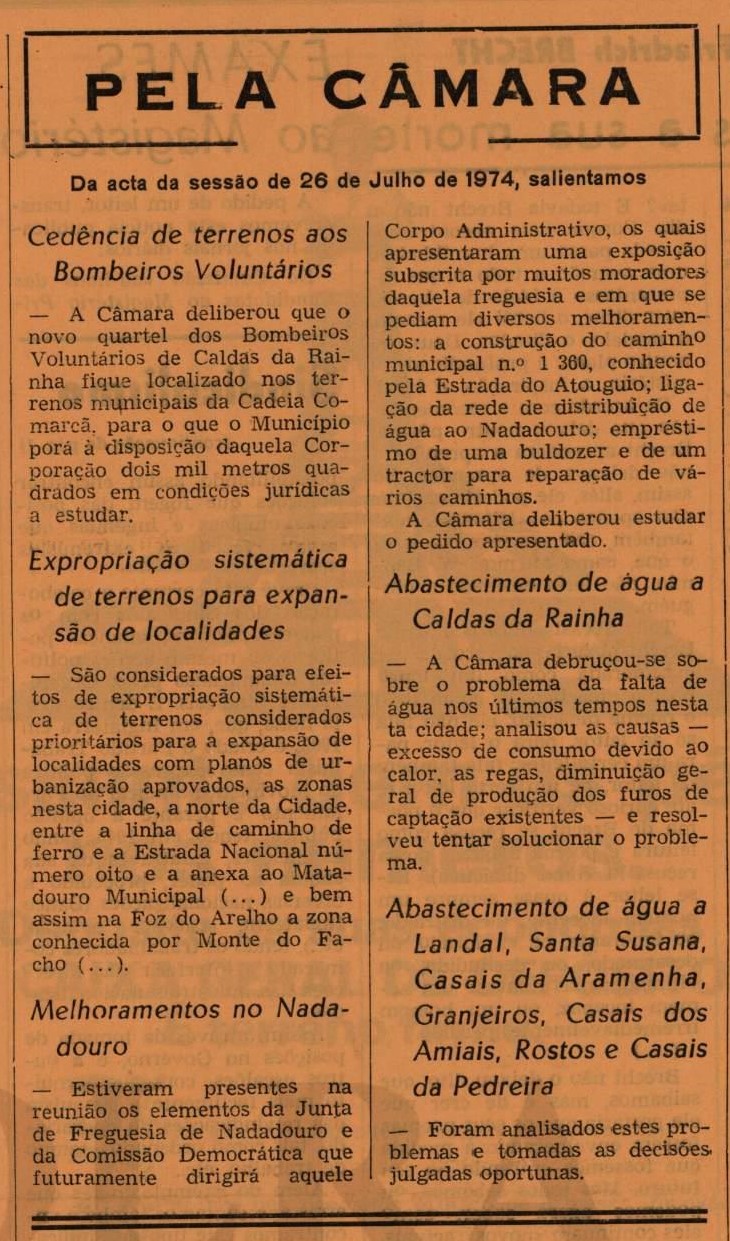 Da autarquia vinha também a novidade da deliberação de que “o novo quartel dos Bombeiros Voluntários de Caldas da Rainha fique localizado nos terrenos municipais da Cadeia Comarcã, para o que o Município porá à disposição daquela Corporação dois mil metros quadrados em condições jurídicas a estudar”. Por outro lado, informava-se de uma expropriação sistemática de terrenos para expansão de localidades. “São considerados para efeitos de expropriação sistemátide terrenos considerados prioritários para a expansão de localidades com planos de urbanização aprovados, as zonas nesta cidade, a norte da Cidade, entre a linha de caminho de ferro e a Estrada Nacional número oito e a anexa ao Matadouro Municipal (…) e bem assim na Foz do Arelho a zona conhecida por Monte do Facho (…)”.