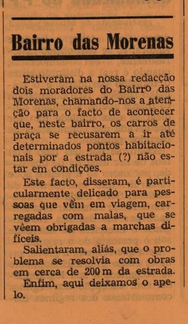 A Gazetadesta semana retrata ainda um problema sentido na cidade, mais precisamente, no Bairro das Morenas. Conta o jornal que “estiveram na nossa redacção dois moradores do Bairro das Morenas, chamando-nos a atenção para o facto de acontecer que, neste bairro, os carros de praça se recusarem a ir até determinados pontos habitacionais por a estrada (?) não estar em condições. Este facto, disseram, é particularmente delicado para pessoas que vêm em viagem, carregadas com malas, que se vêem obrigadas a marchas difíceis. Salientaram, aliás, que o problema se resolvia com obras em cerca de 200 m da estrada. Enfim, aqui deixamos o apelo”.