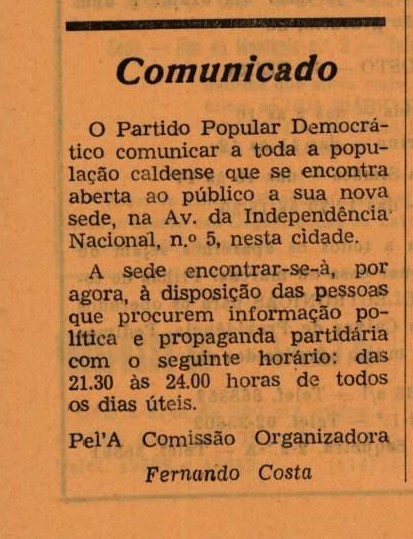 Nota ainda para um artigo intitulado de “Párocos dificultam campanha de alfabetização”, para um comunicado do Partido Popular Democrático a dar conta de “que se encontra aberta ao público a sua nova sede, na Av. da Independência Nacional, n.º 5, nesta cidade” e para mais um cartoon de Figueiredo Sobral.