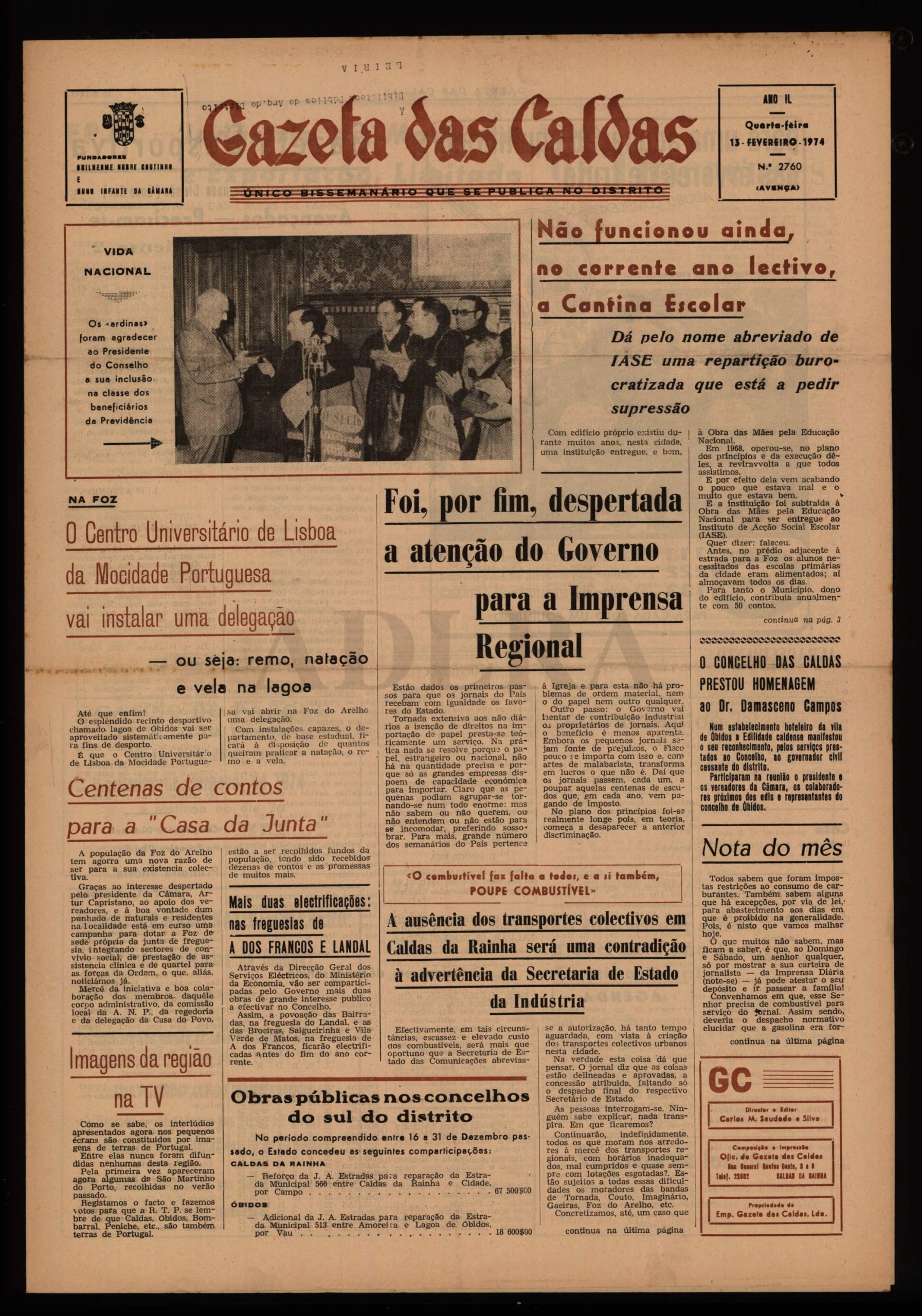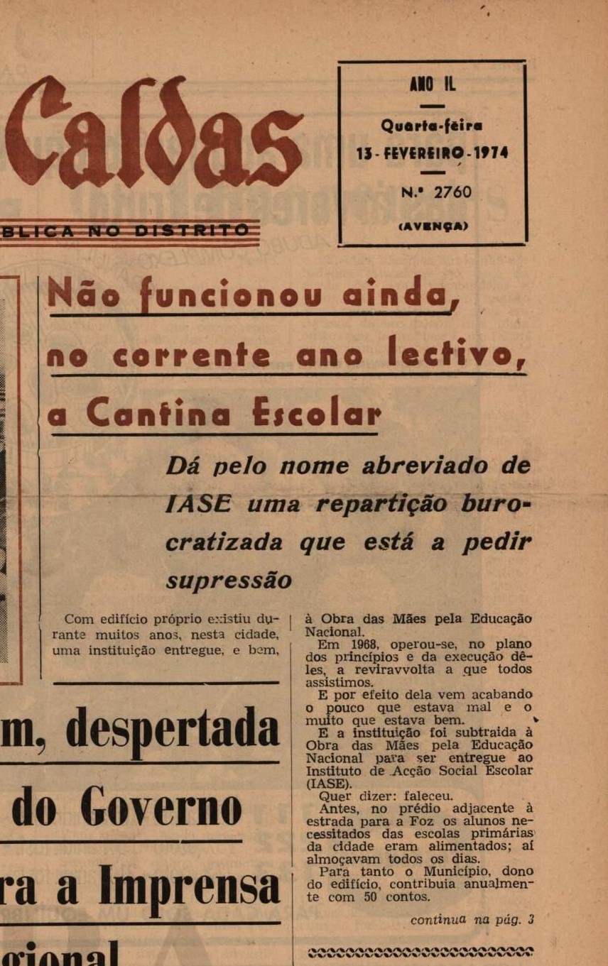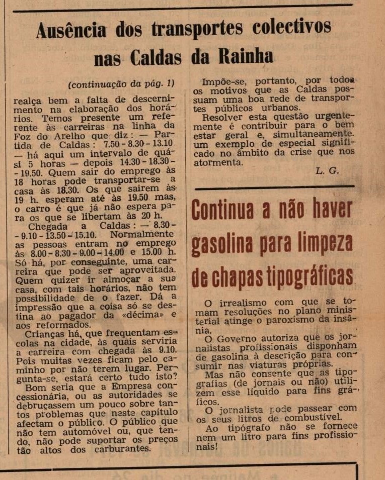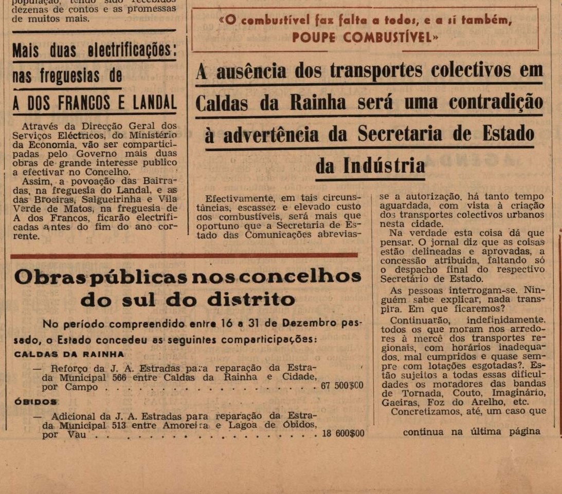 O jornal alertava que “não funcionou ainda, no corrente ano lectivo, a Cantina Escolar” e apontava que “a ausência dos transportes colectivos em Caldas da Rainha será uma contradição à advertência da Secretaria de Estado da Indústria”.