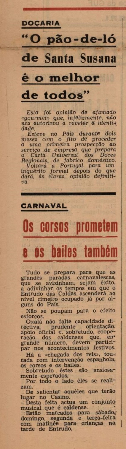 Ficamos também a saber que “o pão-de-ló de Santa Susana é o melhor de todos” e que, por esta época do Carnaval, “os corsos prometem e os bailes também”. A Gazeta conta que “há a chegada dos reis», tourada com intervenção espanhola, os corsos e os bailes. Sobretudo êstes são ansiosamente esperados. Por todo o lado êles se realizam. De salientar aquêles que terão lugar no Casino. Desta feita actua um conjunto musical que é caldense. Estão marcados para sábado, domingo, segunda e terça-feira, com matinée para crianças na tarde de Entrudo”.