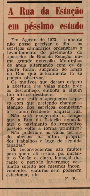 Mas não era caso único. “A Rua da Estação em péssimo estado”, lê-se noutra página. “Em Agosto de 1973- somente não posso precisar o dia serviços camarários ordenaram o levantamento do pavimento do «passeio» da Rua da Estação, numa grande extensão. Montinhos de areia alternando com os de pedra foram surgindo ao longo da Rua que actualmente lá se podem observar.!… Os motivos que deram origem à abertura das valas ainda hoje os desconheço, embora a algum fim útil se destinem. E aqui está o «pequeno» reparo com que pretendo chamar a atenção dos serviços competentes, como residente naquela rua. Não será exagerado o tempo que a Rua da Estação aguarda que o pavimento do respectivo passeio volte à forma primitiva? Não poderiam as valas ter sido abertas na altura própria dos trabalhos e logo de seguida tapadas? Os inconvenientes são muitos para quem ali reside: pó, durante o Verão e, claro, lamaçal durante o período invernoso; vestuário sujeito aos mesmos inconvenientes, viaturas sem poderem estacionar, etc”.